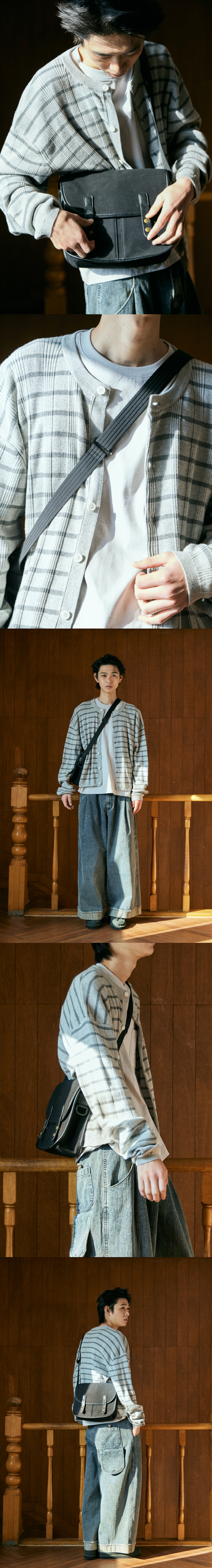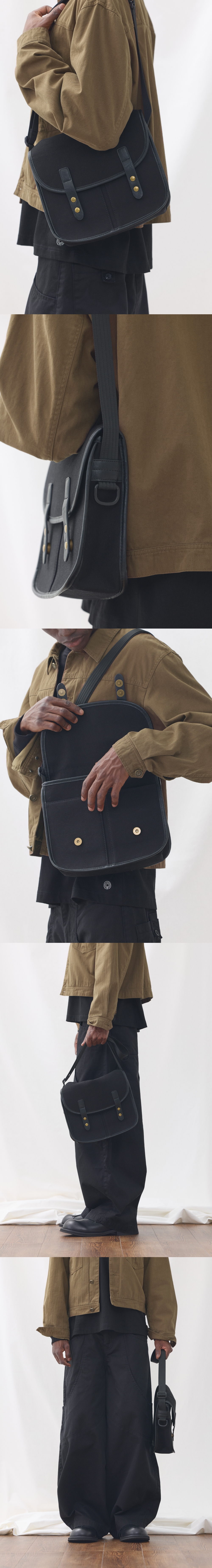 고밀도의 탄탄한 캔버스 원단을 사용한 톤온톤 배색 크로스백 가방 시접 및 모서리부분을 페이크레더 배색으로 고급스러운 느낌을 연출하였습니다. 클로즈 스트랩에 자석 스냅을 사용하여 보다 안정적으로 수납품을 보관 할 수 있습니다. 어깨끈의 버클을 활용하여 끈길이를 최대 111.5cm까지 조절하실수 있습니다. 옆면의 D링에 키링 등 다양한 악세사리를 활용하실수 있습니다. Shell : Cotton 100% FREE : 높이 25, 너비 29
