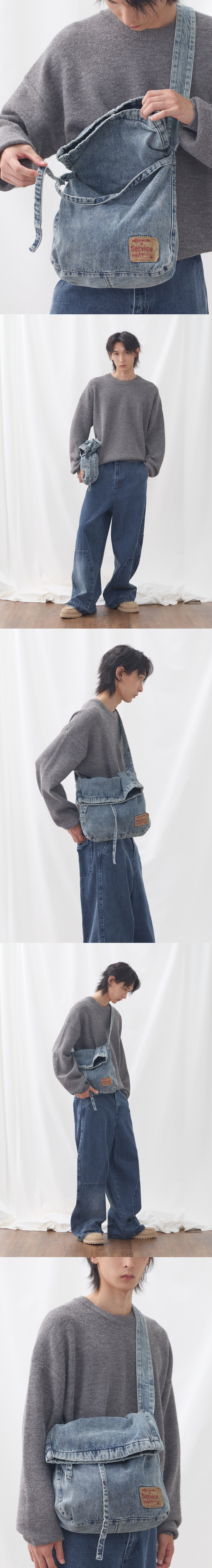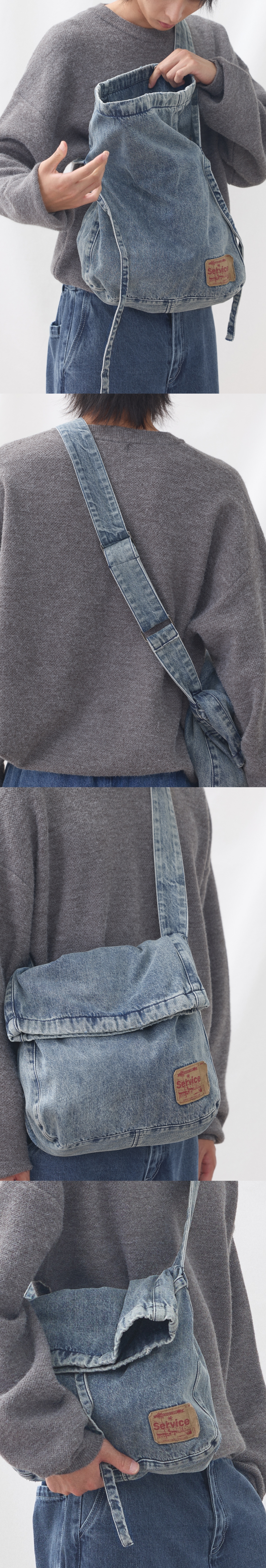 스톤 워싱 및 구제 워싱 디테일로 빈티지한 무드가 연출된 인디고컬러 데님 크로스백 폴디드 스타일 가방에 제원단 스트링을 더하여 기호에 맞는 스타일 및 실루엣 연출 가능 가방 입구 및 내부 포켓에 흑니켈 컬러 금속 스냅을 사용하여 실용성과 내구성을 갖춤 가방 내부 포켓을 활용하여 수납 및 편의성을 연출 브랜드 무드에 맞는 종이 택션지를 같이 워싱하여 빈티지 감성을 연출 SIZE INFO Free : 높이 47 , 폭 36 Shell : Cotton 100%