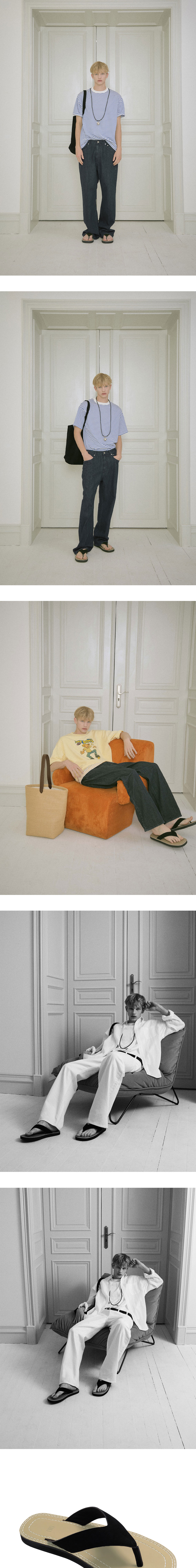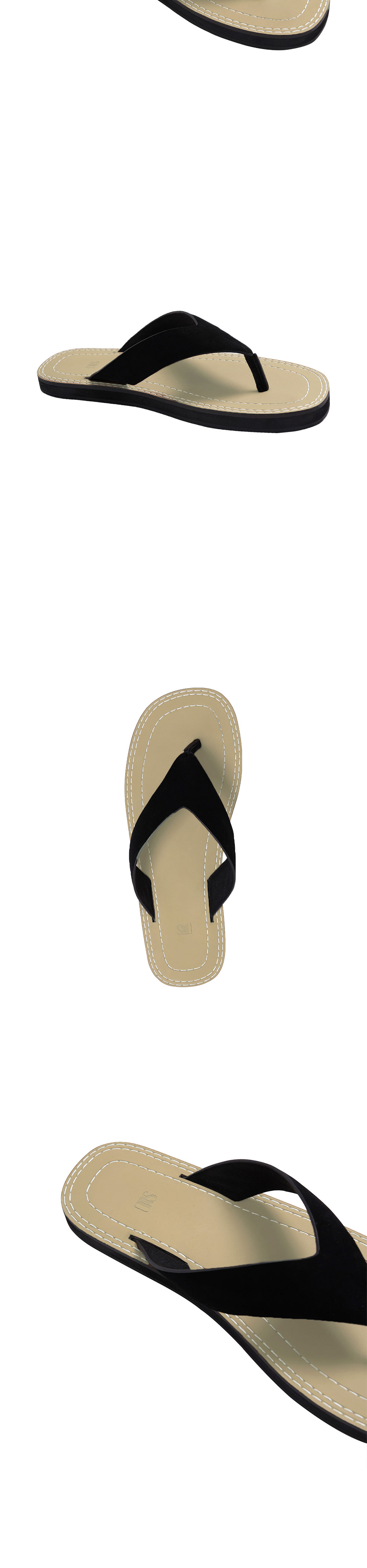 - 플리 플랍 - 블랙 컬러 - 인솔 배색 스티치 - 인솔 아리안스미싱 공법 - 로고 각인 디테일