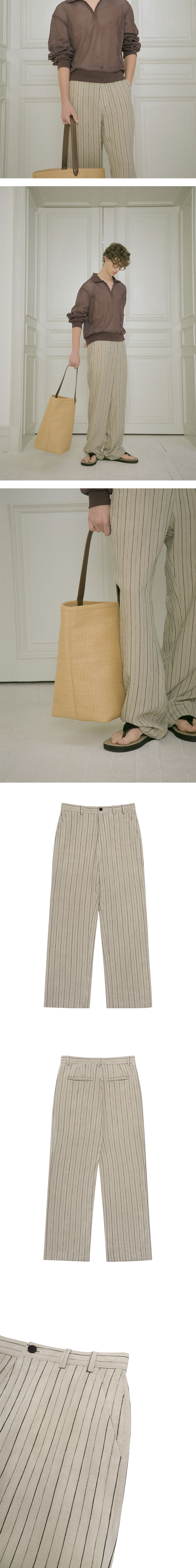 - 스트라이프 패턴 - 사이드 스티치 디테일 - YKK 지퍼 - 로고 각인 소뿔 단추 - 로고 벨트 안감 - 내부 파이핑 처리 - 내부 허리 시접 4cm - 밑단 시접 2.5cm