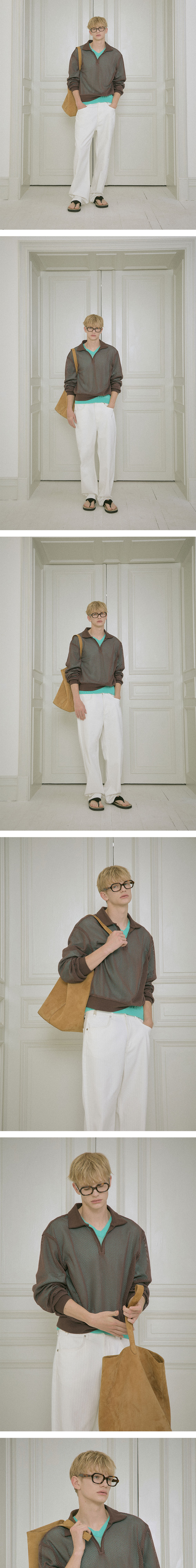 - 스탠다드 핏 - 그물 짜임 원단 - V넥 실루엣 - 자가드 카라 디테일 - 자가드 밴딩 디테일
