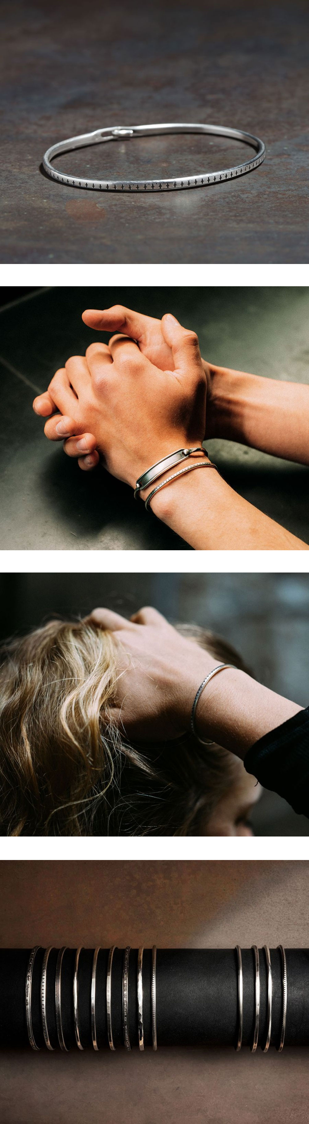 하나의 은선으로 수작업 제작된 베르크슈타트 뮌헨의 실버 뱅글 -빈티지 마크가 은선 위에 각각 다른 흔적을 남기며, 때로는 흐릿하게, 때로는 뚜렷하게 각인 -유니크한 후크 클로징