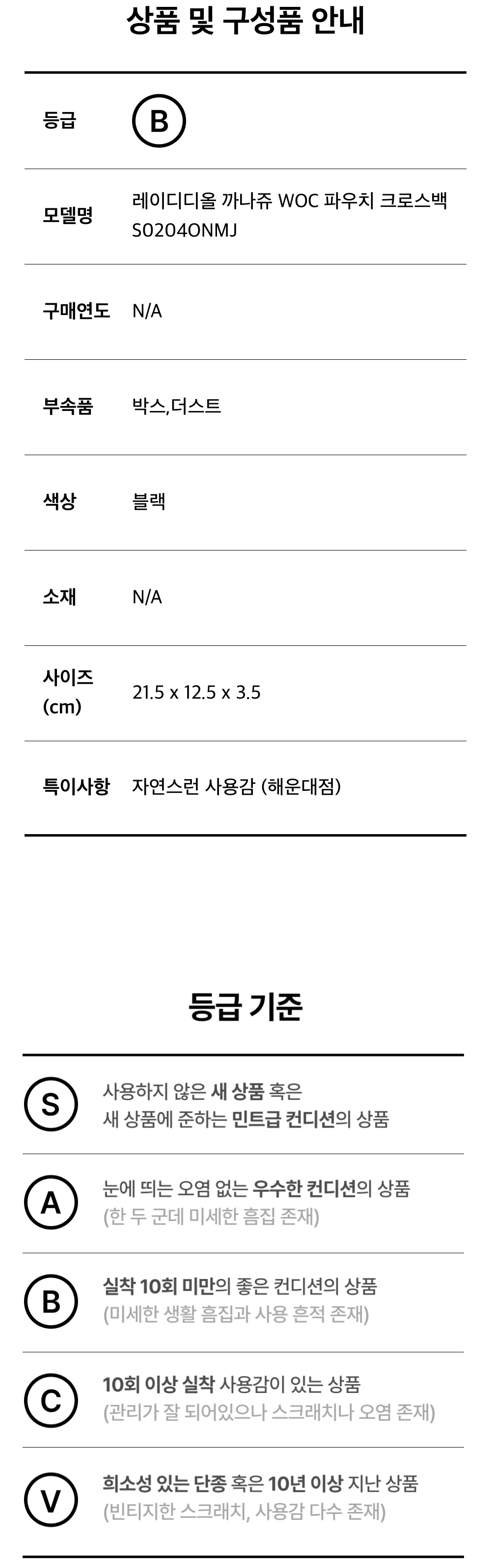 모든 상품(가죽, 의류, 잡화, 슈즈 등)은 사용자의 사용방법과 환경에 따라 변형, 변색이 될 수 있으니 반드시 취급 라벨에 표시된 관리 안내를 따르시길 권장 드립니다. 이는 정도의 차이가 있으며 과도한 체열과 땀, 습기, 빛, 마찰은 제품의 손상 및 변형을 일으킬 수 있으므로 주의하시길 바랍니다.