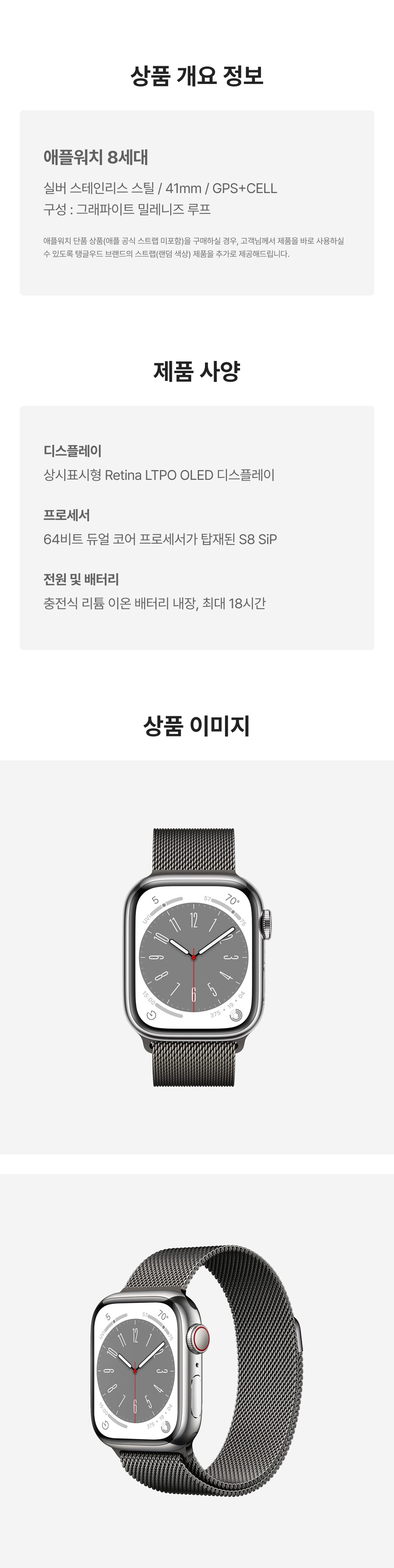[B등급] 리퍼비시 애플워치 8 41mm 셀룰러 실버 스테인리스 스틸 케이스 밀레니즈 루프 그래파이트