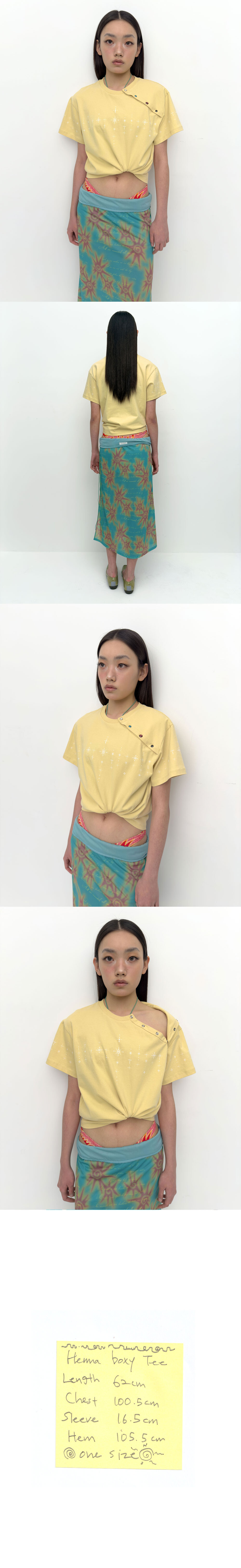 코튼 져지 소재 박시 핏 앞면 왼쪽에 스냅버튼 여밈 앞면과 소매에 발염 프린트 OS 사이즈 Cotton jersey box tee Boxy-fit Snap buttons closure at front-left Burn-out graphic print at front and sleeves One size CARE 단독 드라이클리닝을 권장합니다. 중성세제를 사용하여 찬물에 단독 손세탁을 권장합니다. 물에 장시간 방치, 탈색제, 건조기 사용 시 의류가 손상될 수 있으니 주의 바랍니다. 이염 우려가 있으니 열이나 젖은 상태를 피하시고 밝은 소재의 의류와 분리하여 주십시오.