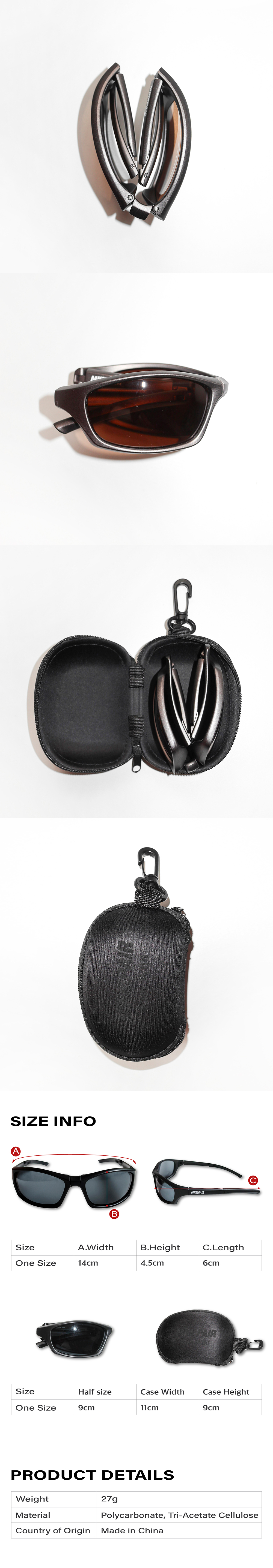 ☆ information - 굴곡 있는 쉐입 - 옆면 ‘MNMPAIR’, ‘RUN WILD’ 로고 - 키링 하드 케이스 - 폴리카보네이트, 트리아세테이트 소재 - UV 400으로 자외선 차단 - 24g의 가벼운 무게 * 접이식 선글라스로 여행, 캠핑, 스포츠 등 편하게 착용 및 소지할 수 있습니다. 케이스는 키링 형태로 가방, 팬츠, 그 어디에도 매치할 수 있습니다. ☆ Size 140mm x 45mm (가로, 세로) Width 14cm Length 6cm Height 4.5cm Made in China