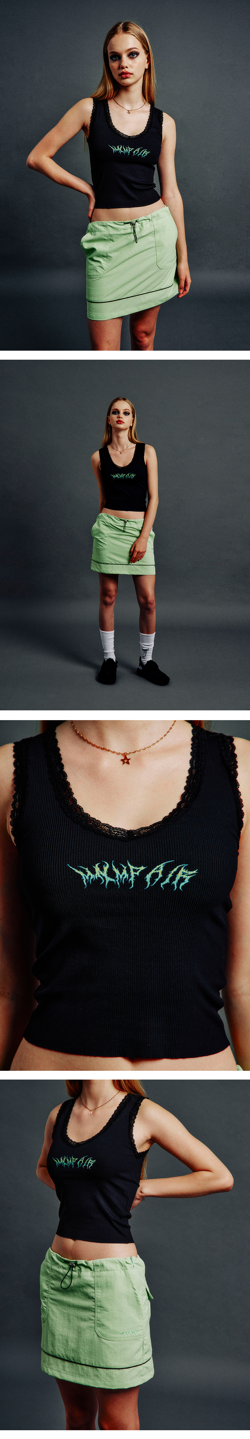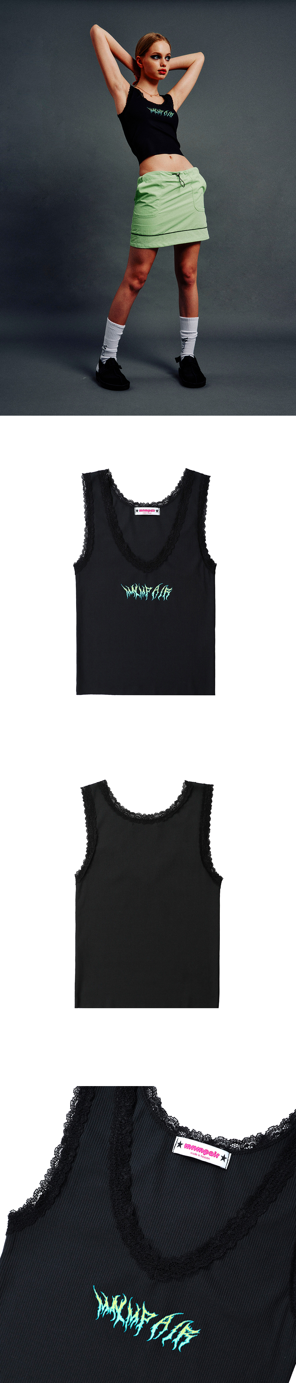 ☆ information - lace - metal logo printing - 레이스, 메탈 로고 프린팅 ☆ Matrerial & Care Poly 90% Span 10% Gentle hand wash / Dry cleaning 부드러운 손세탁 / 드라이클리닝 ☆ Size S shoulder 26 chest 29.5 hem 29 armhole 18 length 45 M shoulder 27 chest 32.5 hem 32.5 armhole 18 length 46 ☆ Model size Height 167cm Bust 83cm Waist 60cm Hips 90cm Wearing Size Small