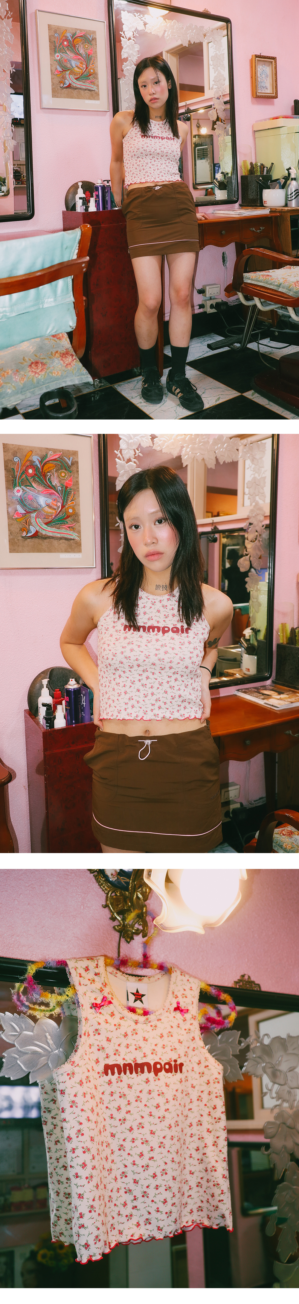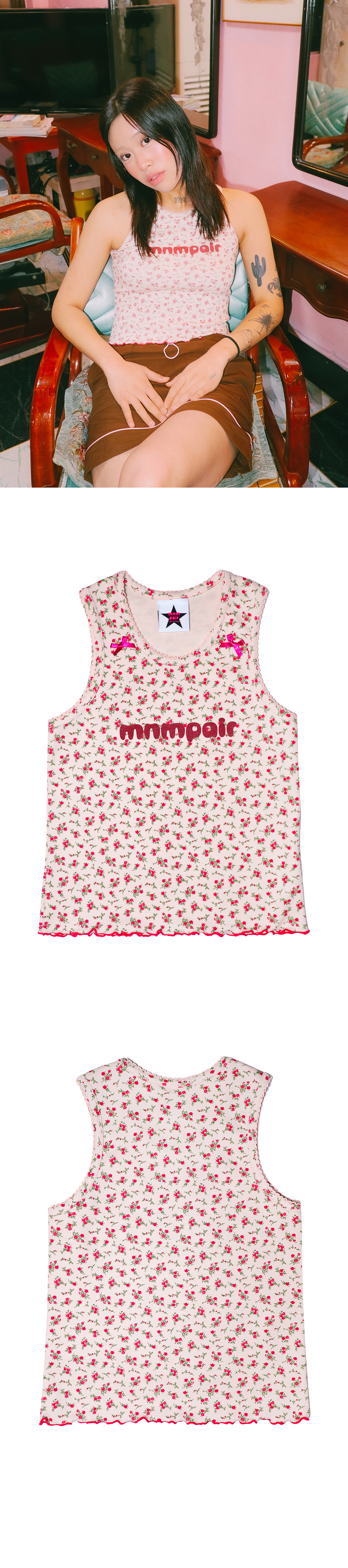 ☆ information - Floral pattern - Two hot pink ribbon ☆ Matrerial & Care Cotton 82% Poly 18% Gentle hand wash / Dry cleaning 찬물단독세탁 / 드라이클리닝 ☆ Size S - shoulder 24 chest 31.5 hem 33 armhole 16 length 46 M - shoulder 25 chest 33.5 hem 35 armhole 17 length 47 * model - S