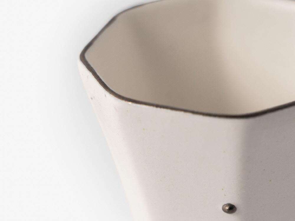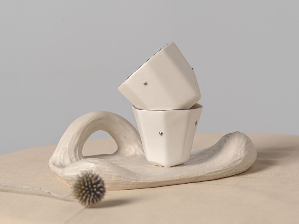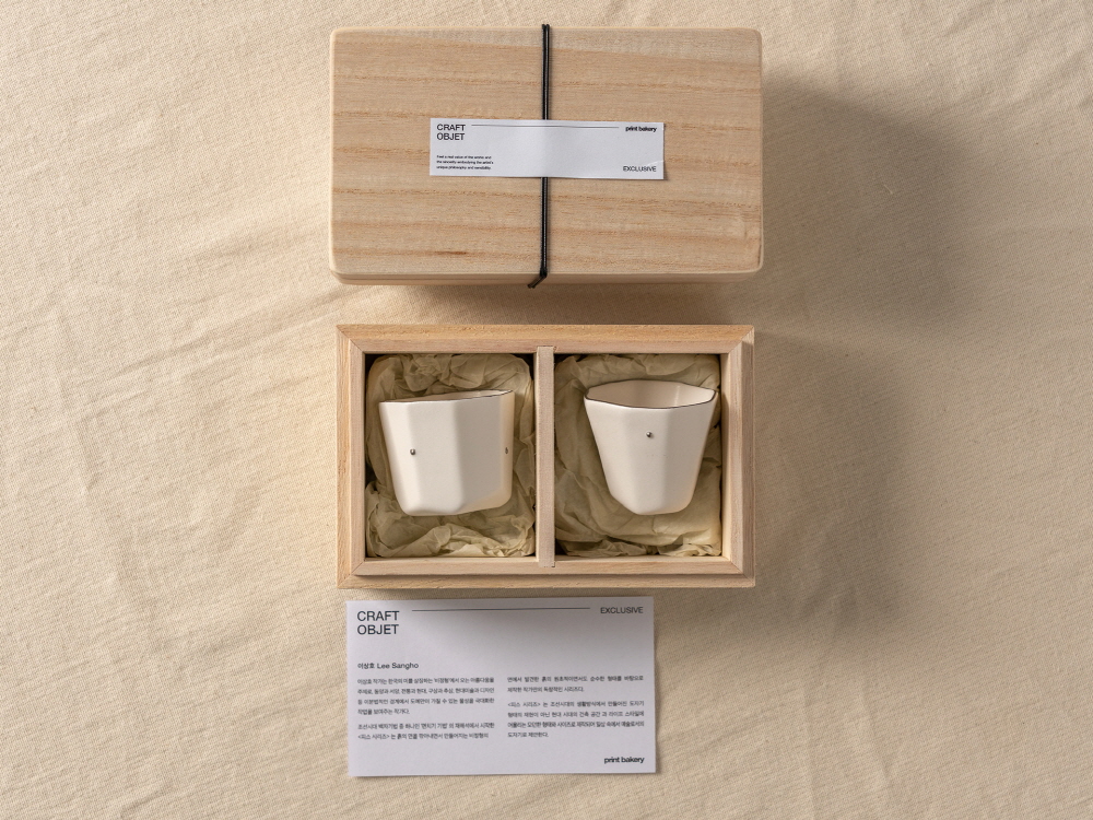 크기 6 x 6 x H 5 cm 제작방식 Hand made 소재 Ceramic, Silver 구성품 잔 2p (1set) 이상호 작가는 한국의 미를 상징하는 '비정형'에서 오는 아름다움을 주제로, 동양과 서양, 전통과 현대, 구상과 추상, 현대미술과 디자인 등 이분법적인 경계에서 도예만이 가질 수 있는 물성을 극대화한 작업을 보여주는 작가다. 조선시대 백자기법 중 하나인 ‘면치기 기법’ 의 재해석에서 시작한 < 피스 시리즈 > 는 흙의 면을 깎아내면서 만들어지는 비정형의 면에서 발견한 흙의 원초적이면서도 순수한 형태를 바탕으로 제작한 작가만의 독창적인 시리즈다. < 피스 시리즈 > 는 조선시대의 생활방식에서 만들어진 도자기 형태의 재현이 아닌 현대의 건축 공간 과 라이프 스타일에 어울리는 모던한 형태와 사이즈로 제작되어 일상 속에서 예술로서의 도자기로 제안한다.