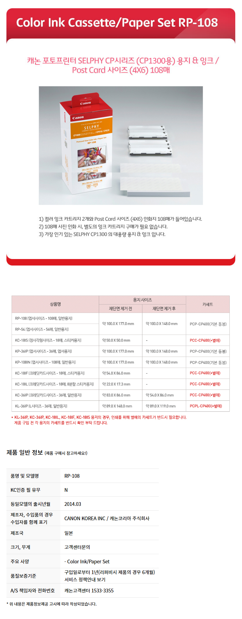 캐논 셀피 엽서사이즈 108매 인화지 RP-108 (CP1500 용)