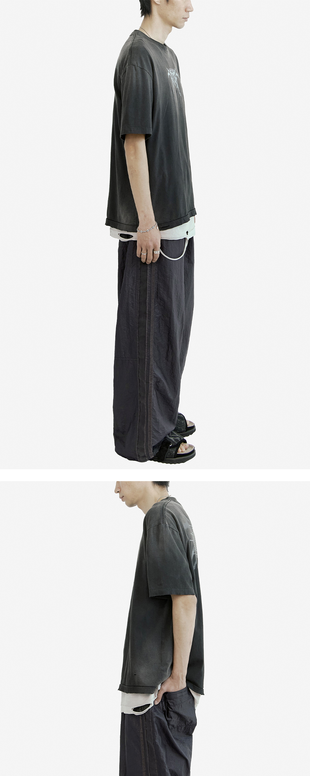 glossy track pants - black, dark navy, khaki gray 글로시한 나일론 원단을 베이스로 제작된 트랙 팬츠. 사이드 라인은 독특한 조직의 테잎 및 배색감으로 구성되며, 포켓 상/하단의 페이즐리 자가드 배색이 특징적. 가먼트 째로 피그먼트 다잉 및 워싱, 착용 횟수가 쌓이며 점차 부드러워지는 원단감. 밑단 스트링과 스트링 고정장치, 포켓의 메쉬 안감. 트랙팬츠에는 잘 적용되지 않는 금속 버튼과 지퍼 플라이 등 숨은 디테일이 매력적인 팬츠입니다. *본 제품은 완성 후 후염 가공 적용된 제품입니다. 착용 초기, 후면 포켓의?벨크로 부분에서 미세 이염이 존재할 수 있습니다. 물로 간단히 세척 가능하나, 착용 초기 주의 부탁드립니다. *직전 차수 대비, 금번 차수의 경우?유사한 컬러감, 유사한?실측 및 착용감으로 제작되었습니다. 정확한 상세 사이즈의 경우, 실측표 확인 부탁드립니다. *모델: 170 중반 / 마른 체형, 3사이즈 착용
