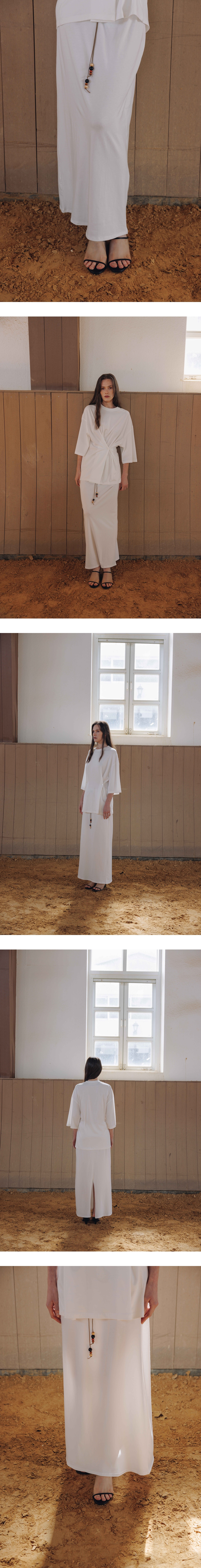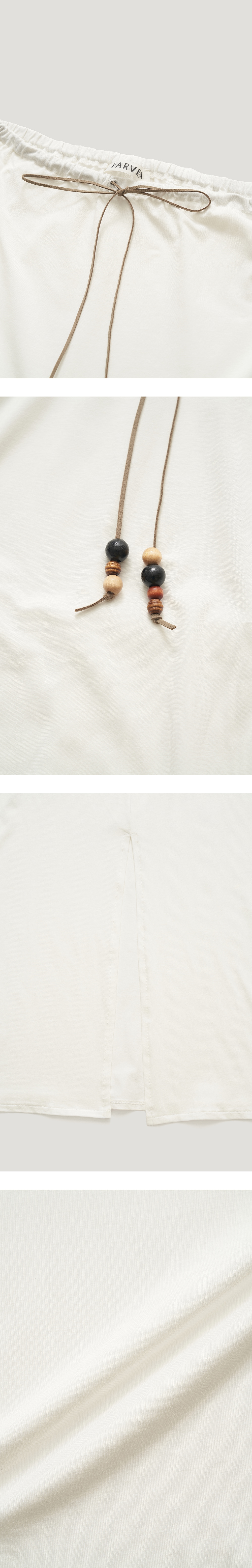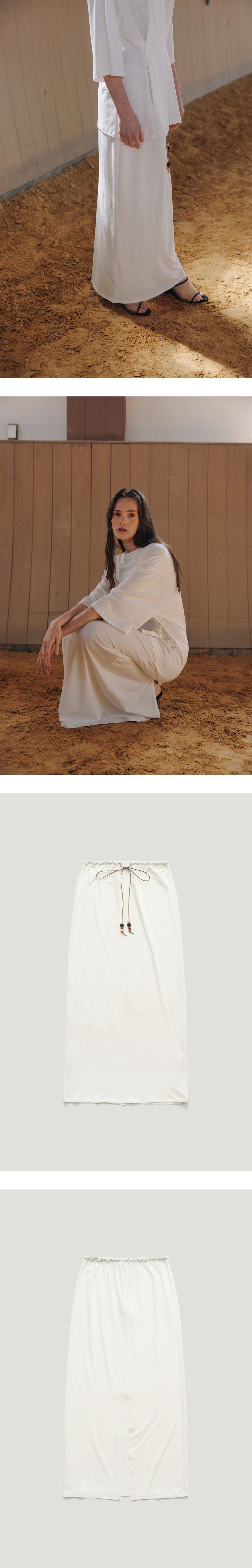 베이직한 디자인에 드로스트링 디테일이 돋보이는 롱스커트입니다. 전체 적으로 루즈한 실루엣에 얇은 소재감이 내추럴한 무드를 강조해주며 코튼 /모달 혼방소재로 탄탄하고 견고하며 소프트한 터치감이 특징인 제품입니 다. 허리에 스웨이드소재의 스트링과 우드소재의 비즈볼디테일이 달려있 으며 사이즈에 맞게 조절이 가능하여 편안하고 안정감있는 착용이 가능합 니다. MEMO 4WAY MODAL T-SHIRT 와 셋업으로 착용이 가능합니다. - 천연우드장식 특성상 컬러와 무늬 패턴이 다를 수 있습니다. 이점은 불량사유가 아니므로, 반품사유에 해당되지 않습니다. VLADA wearing a size FREE. MODEL : HEIGHT 173 / BUST 39.5 / WAIST 30.5 / HIPS 44.5