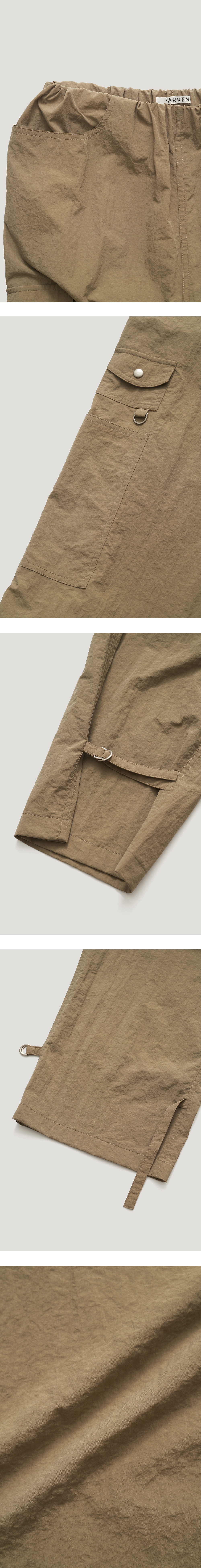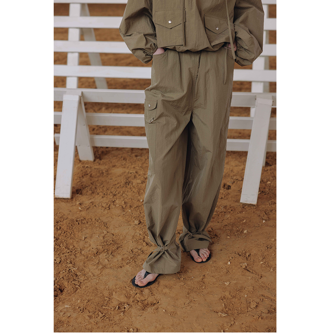 스포티한 무드를 가진 나일론 팬츠입니다.다양한 크기와 디자인을 가진 4 개의 포켓이 있어 실용도가 좋으며,허리는 밴딩으로 되어있어 사이즈에 구 애받지 않고 편안하게 착용이 가능합니다.밑단에는 스트랩으로 포인트를 주어 와이드핏과 조거핏으로 사이즈를 조절하여 3way 스타일을 연출하 실 수 있습니다. TAMO wearing a size FREE. MODEL : HEIGHT 172 / BUST 39 / WAIST 30 / HIPS 44