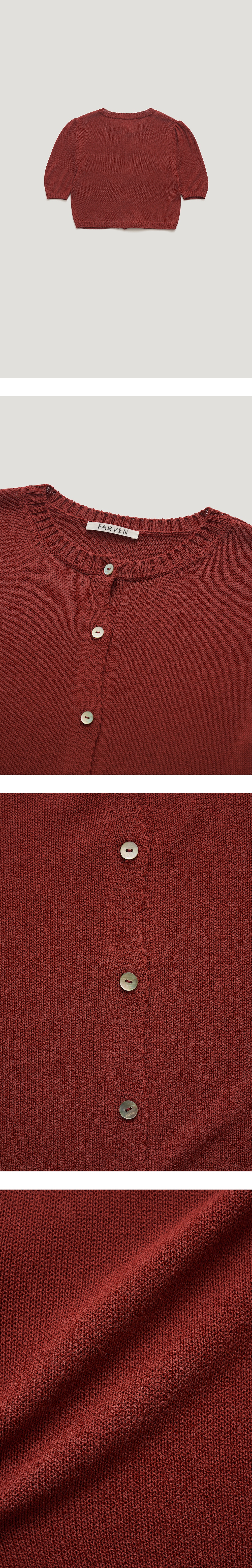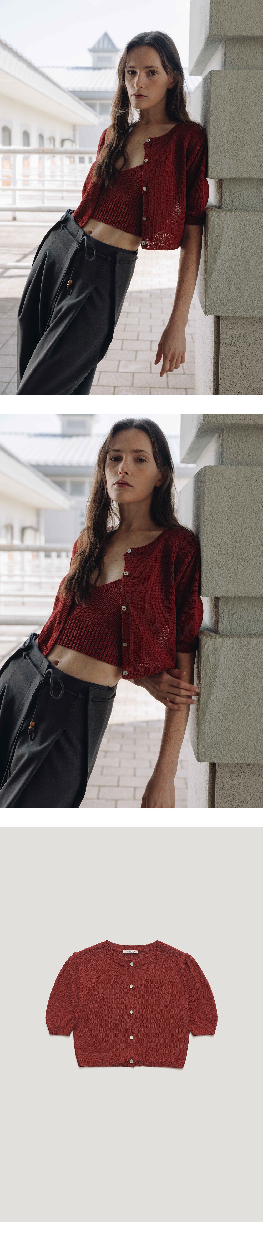 베이직한 디자인의 크롭 린넨 니트 가디건 입니다.파르벵 로고가 새겨진 자 개단추 디테일을 주었고,소매라인 볼륨감을 자연스럽게 주어 여성스러운 감 도를 더해주었습니다.가볍고 통기성이 좋은 린넨 혼방 원사로 짜여져 썸머 아이템으로 활용도가 매우 좋으며,다양한 이너 또는 단독착용으로 다양한 스 타일 연출이 가능한 아이템입니다. VLADA wearing a size FREE. MODEL : HEIGHT 173 / BUST 39.5 / WAIST 30.5 / HIPS 44.5