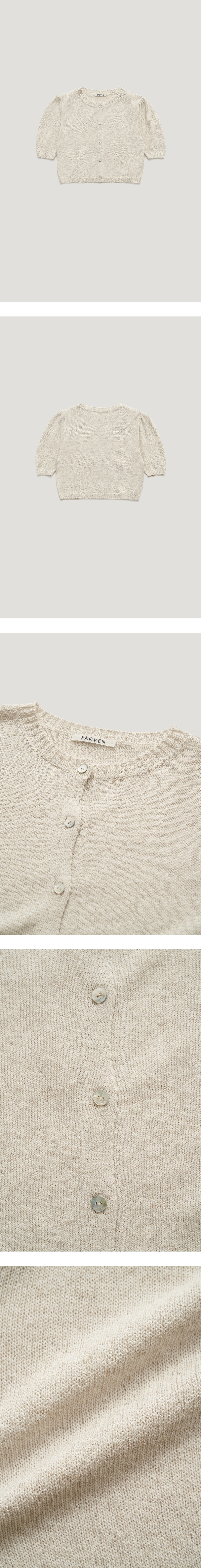 베이직한 디자인의 크롭 린넨 니트 가디건 입니다.파르벵 로고가 새겨진 자 개단추 디테일을 주었고,소매라인 볼륨감을 자연스럽게 주어 여성스러운 감 도를 더해주었습니다.가볍고 통기성이 좋은 린넨 혼방 원사로 짜여져 썸머 아이템으로 활용도가 매우 좋으며,다양한 이너 또는 단독착용으로 다양한 스 타일 연출이 가능한 아이템입니다. TAMO wearing a size FREE. MODEL : HEIGHT 172 / BUST 39 / WAIST 30 / HIPS 44