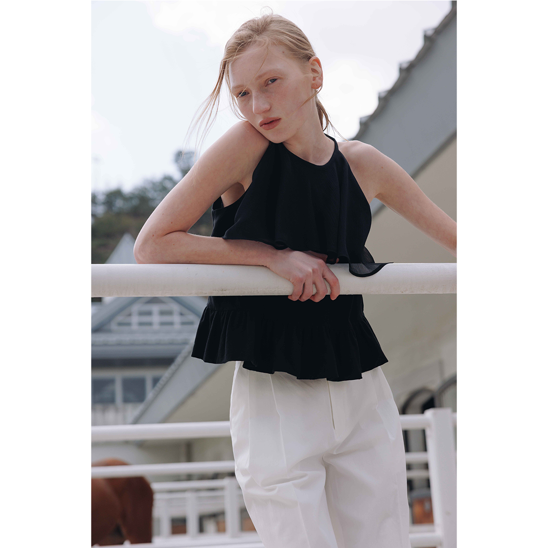 탄탄하고 신축성이 좋은 코튼소재와 은은하게 비치는 시어한 소재가 덧대 어진 홀터넥 블라우스입니다.어깨 라인이 슬림해보이는 실루엣으로 여성 스러움과 세련된 무드를 주며,다양한 하의 아이템과 매칭하여 포인트 주기 좋은 블라우스입니다. TAMO wearing a size FREE. MODEL : HEIGHT 172 / BUST 39 / WAIST 30 / HIPS 44