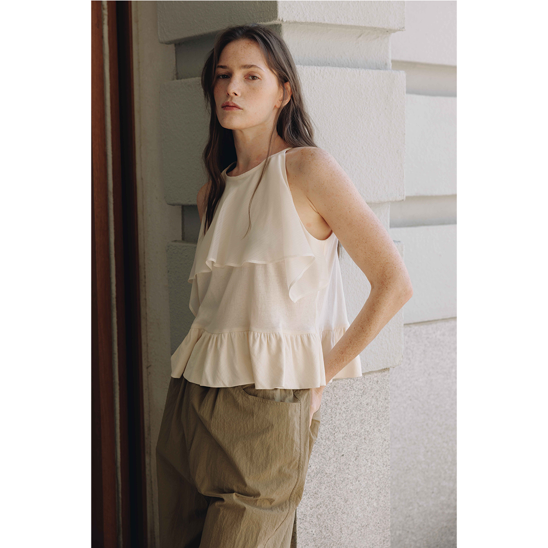 탄탄하고 신축성이 좋은 코튼소재와 은은하게 비치는 시어한 소재가 덧대 어진 홀터넥 블라우스입니다.어깨 라인이 슬림해보이는 실루엣으로 여성 스러움과 세련된 무드를 주며,다양한 하의 아이템과 매칭하여 포인트 주기 좋은 블라우스입니다. VLADA wearing a size FREE. MODEL : HEIGHT 173 / BUST 39.5 / WAIST 30.5 / HIPS 44.5