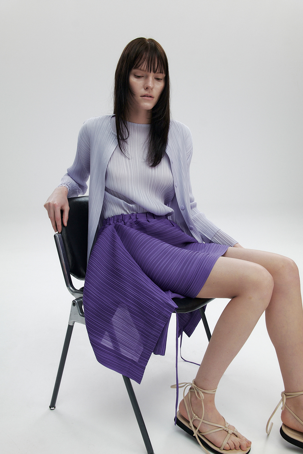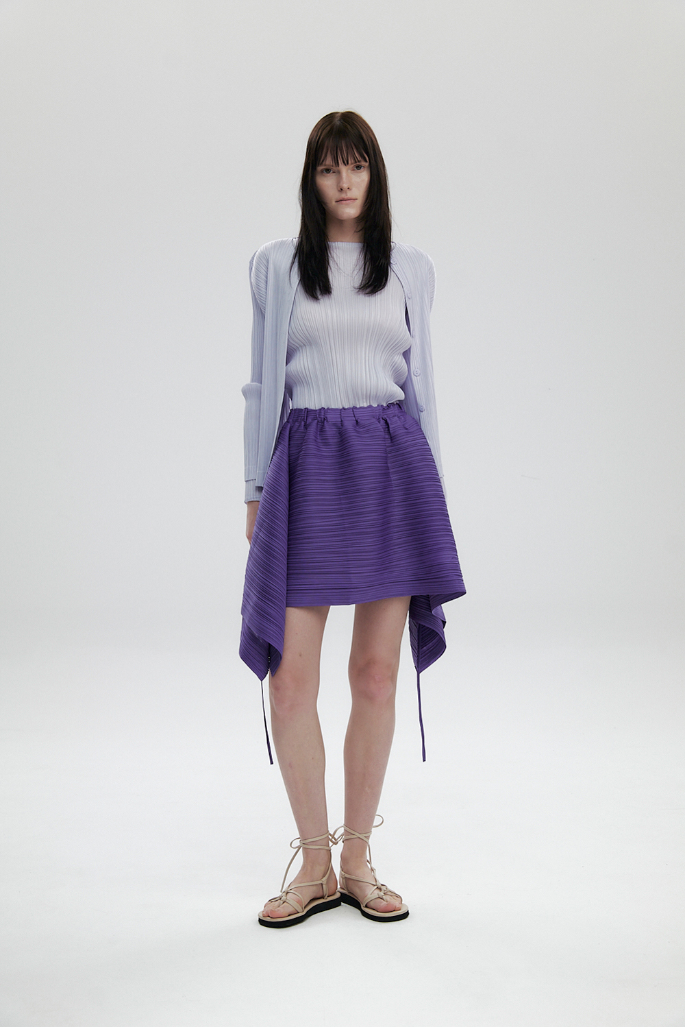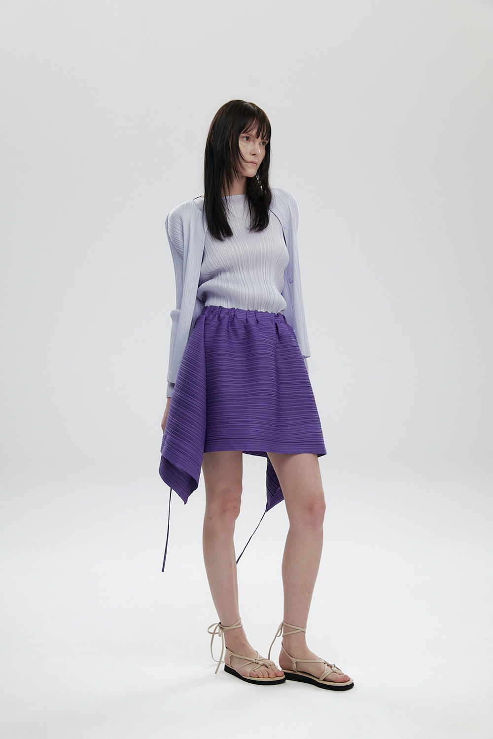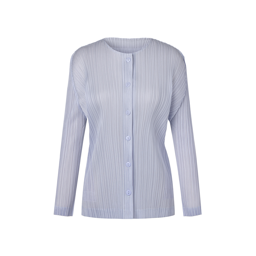 몽플리쎄 여성 라운드넥 라이트 플리츠 가디건 라벤더