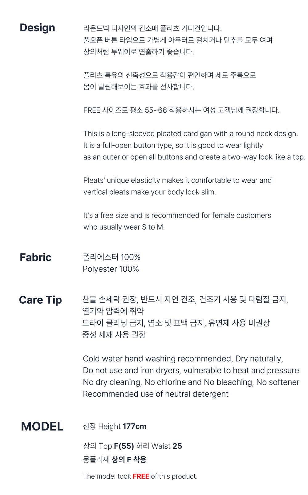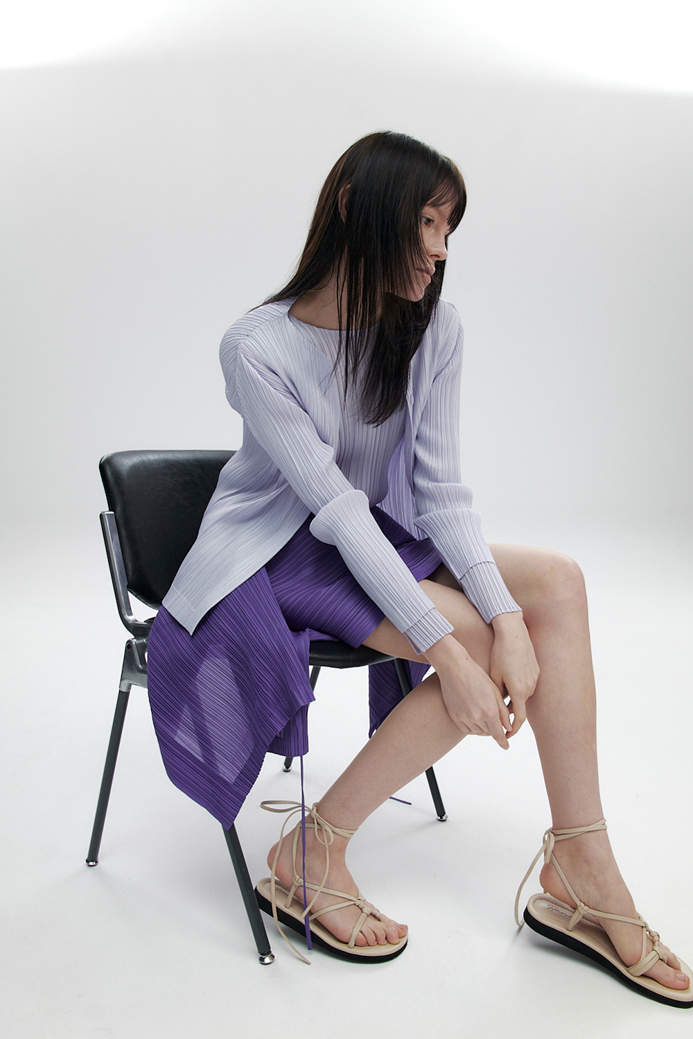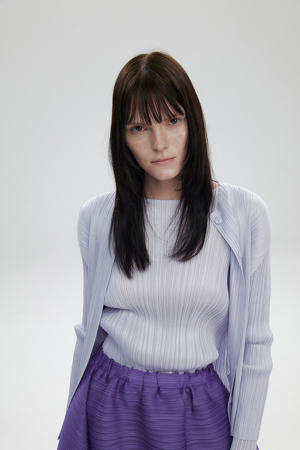 몽플리쎄 여성 라운드넥 라이트 플리츠 가디건 라벤더