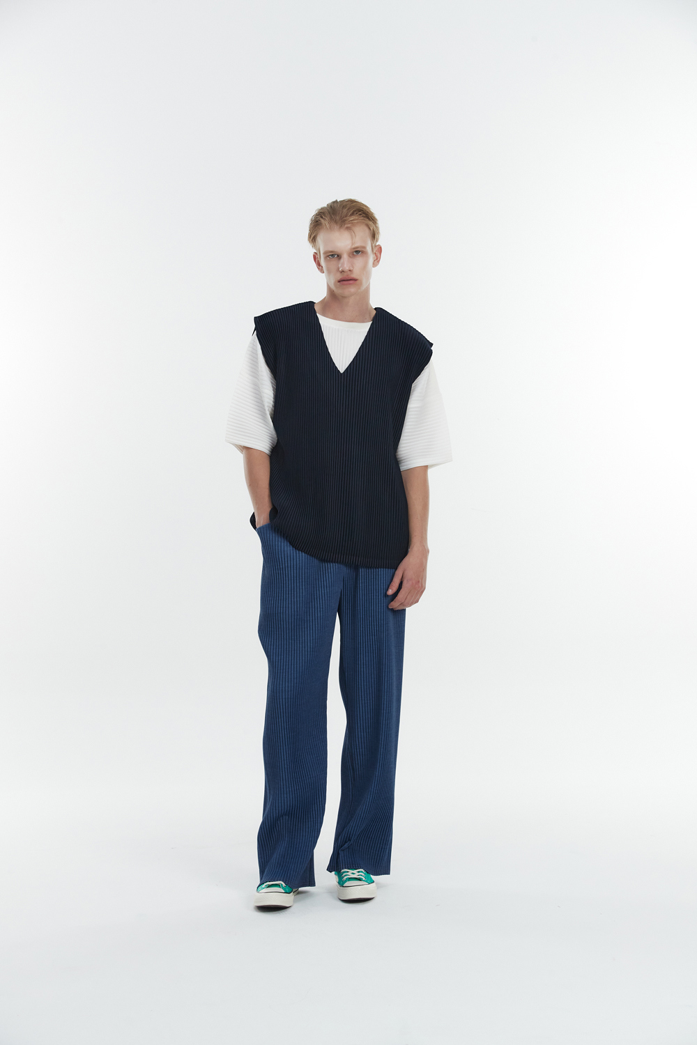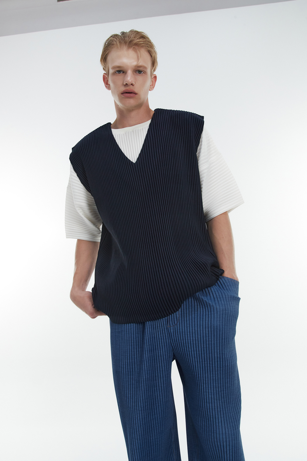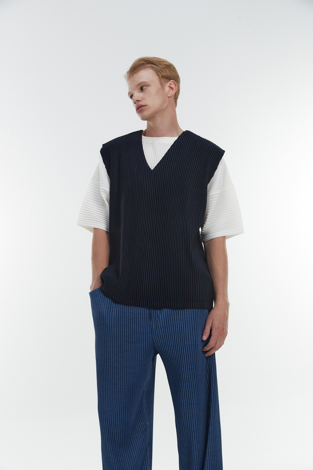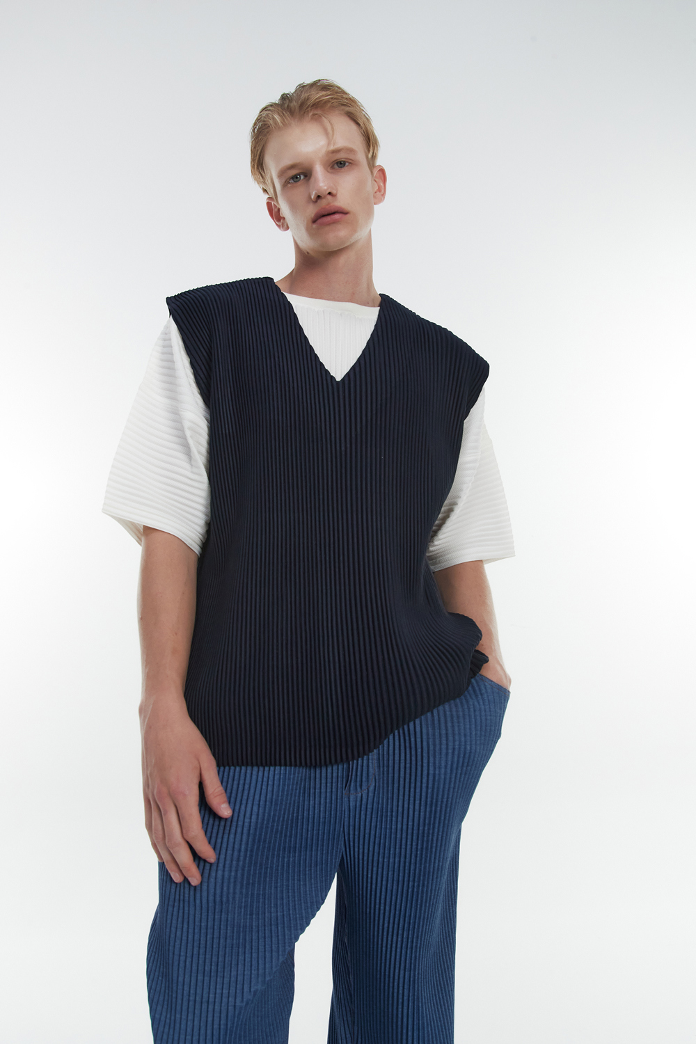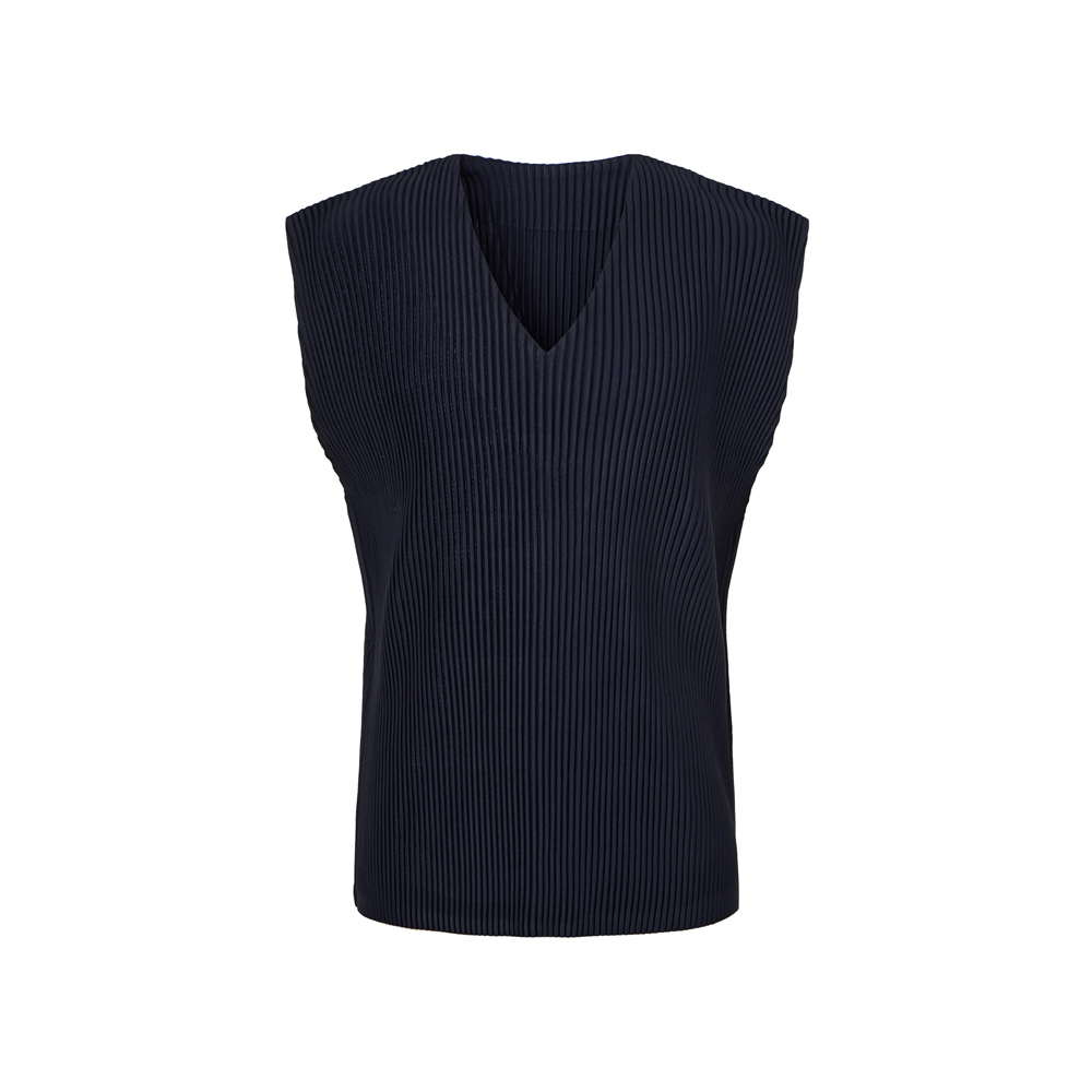 Monplisse Unisex V-Neck Basic Pleats Vest Navy