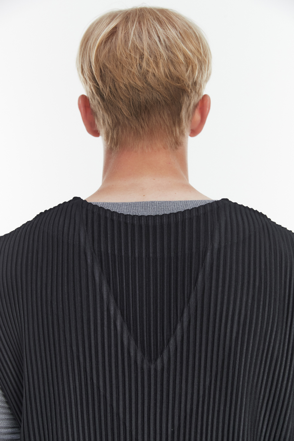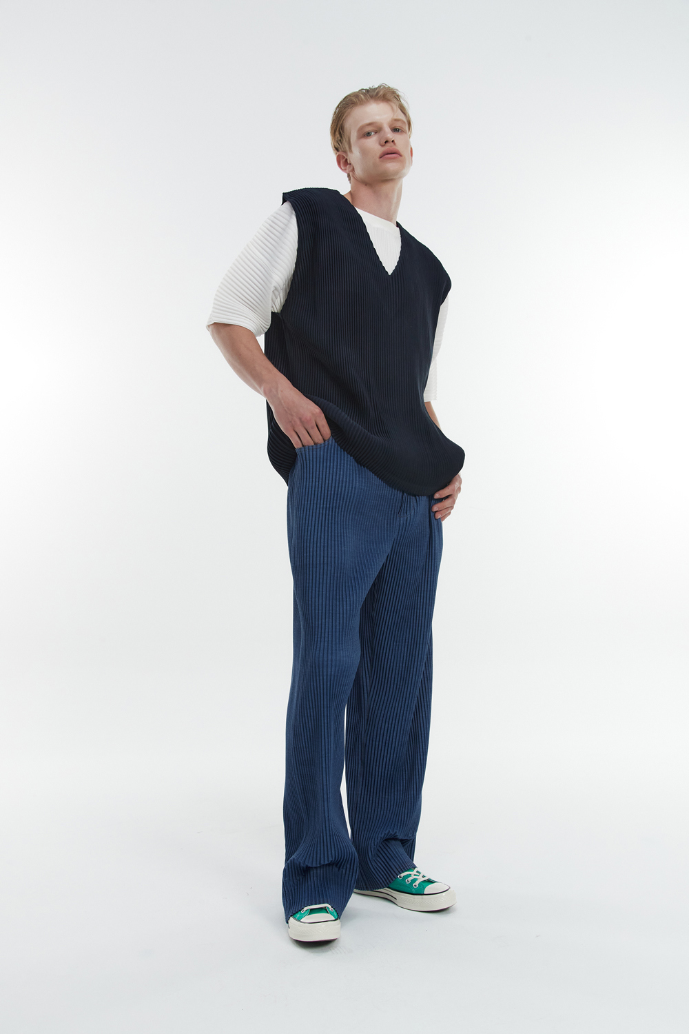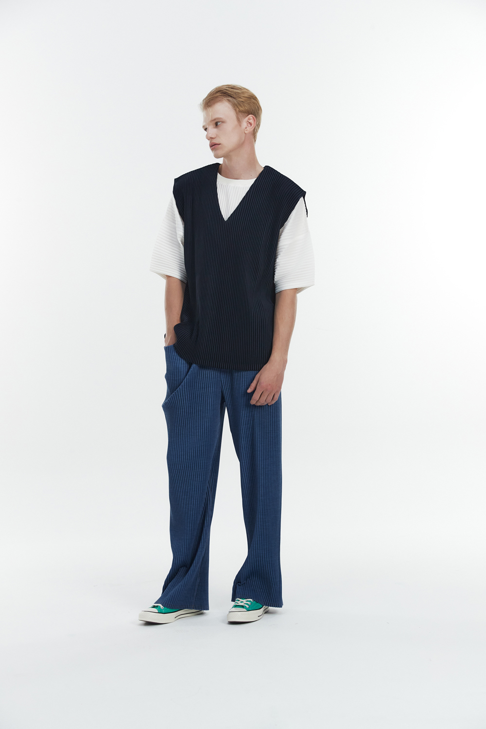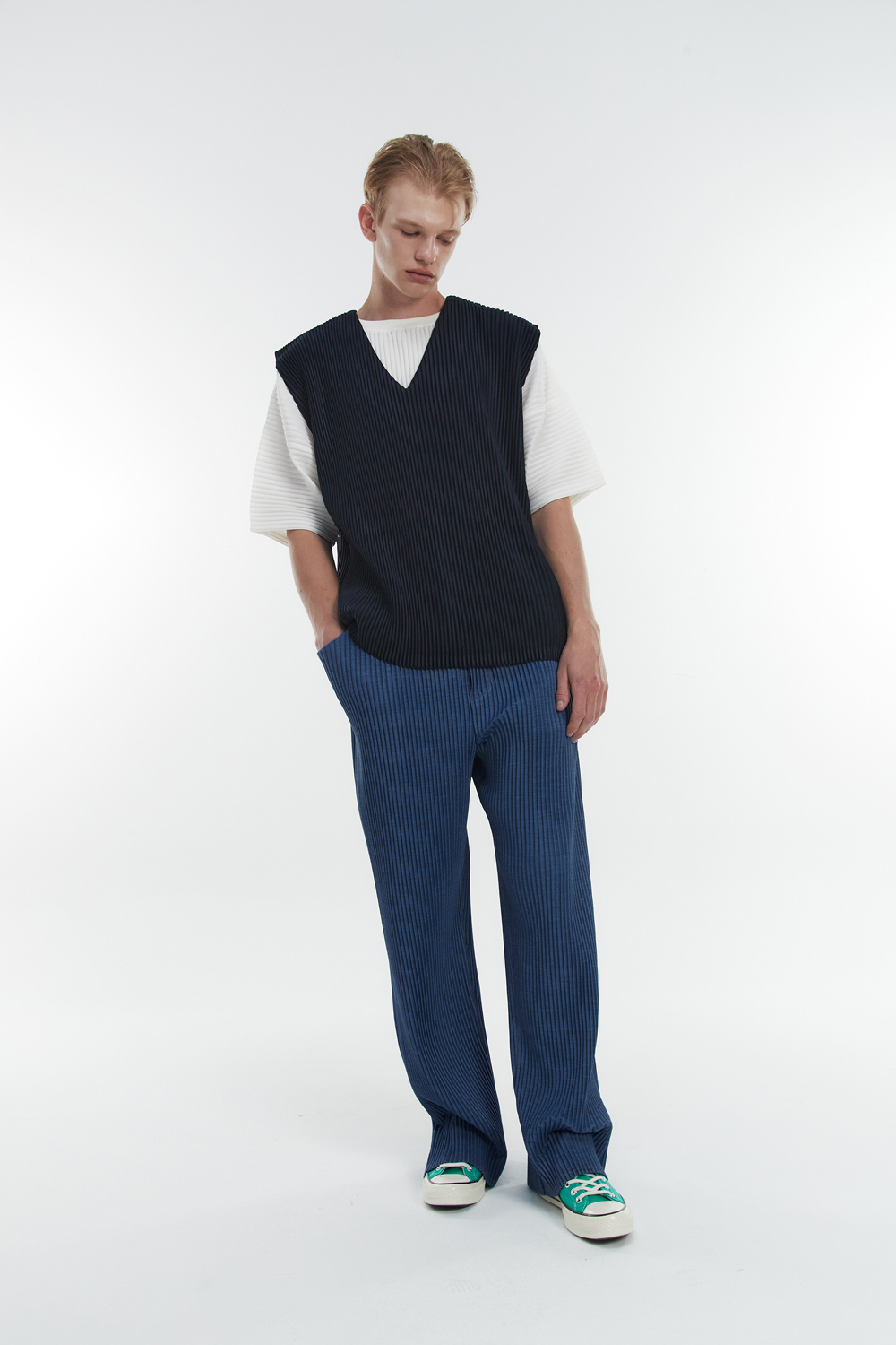 Monplisse Unisex V-Neck Basic Pleats Vest Navy