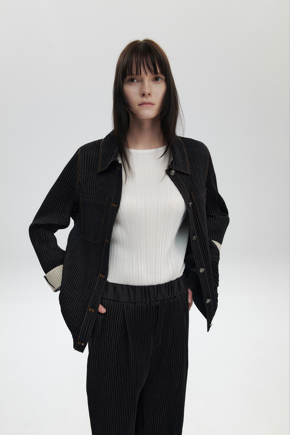 몽플리쎄 공용 데님 플리츠 롤업 커프스 자켓 블랙