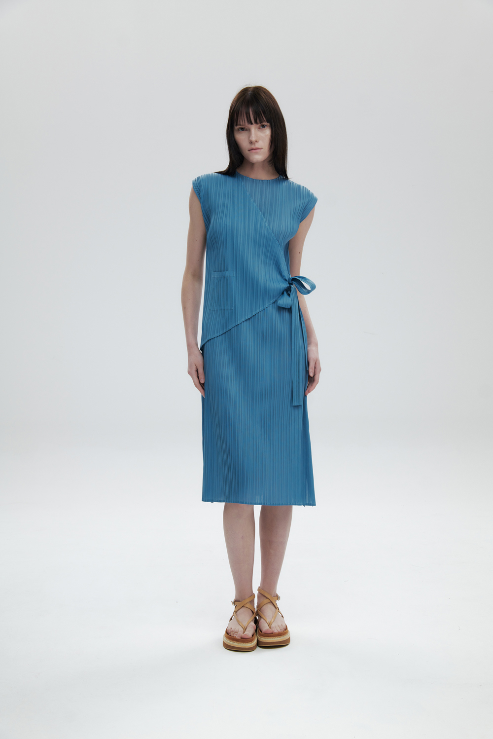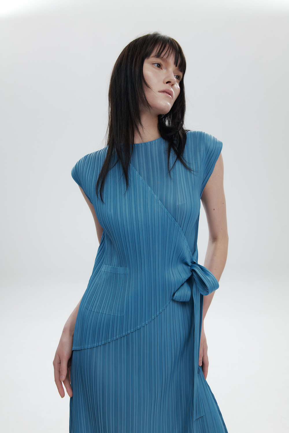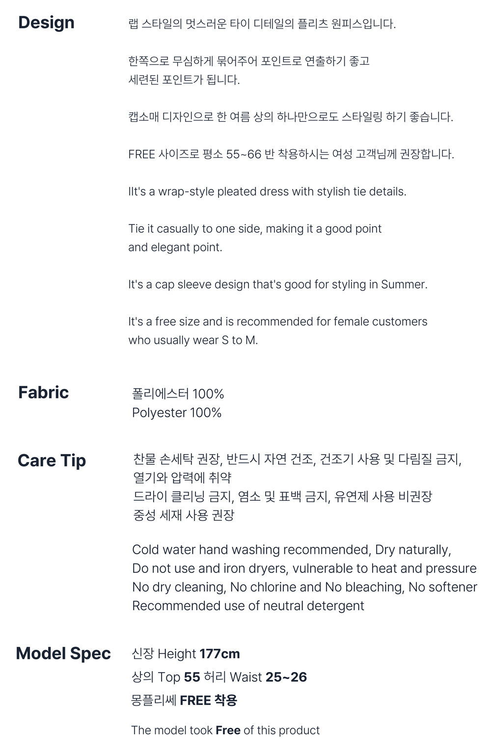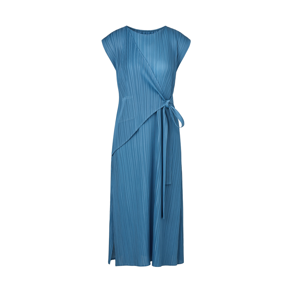 몽플리쎄 여성 타이드 랩 스타일 캡소매 플리츠 원피스 블루
