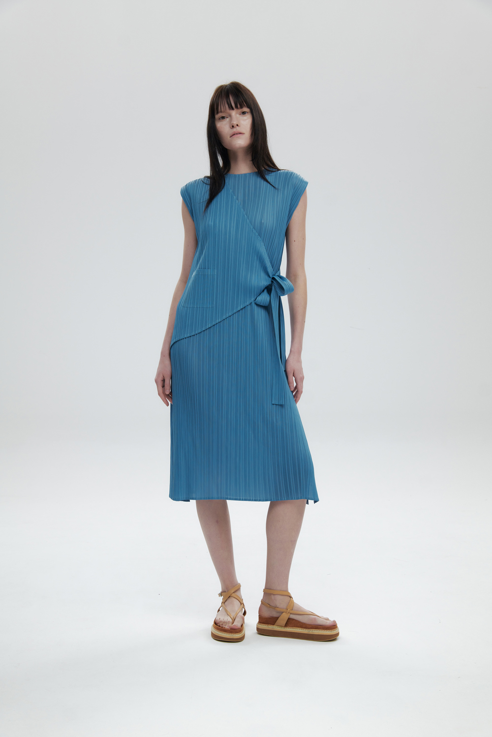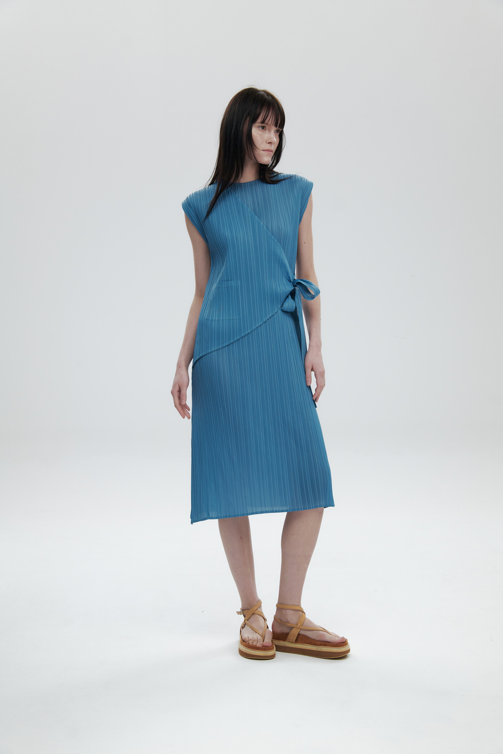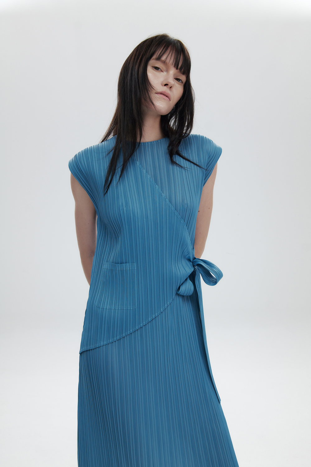 몽플리쎄 여성 타이드 랩 스타일 캡소매 플리츠 원피스 블루