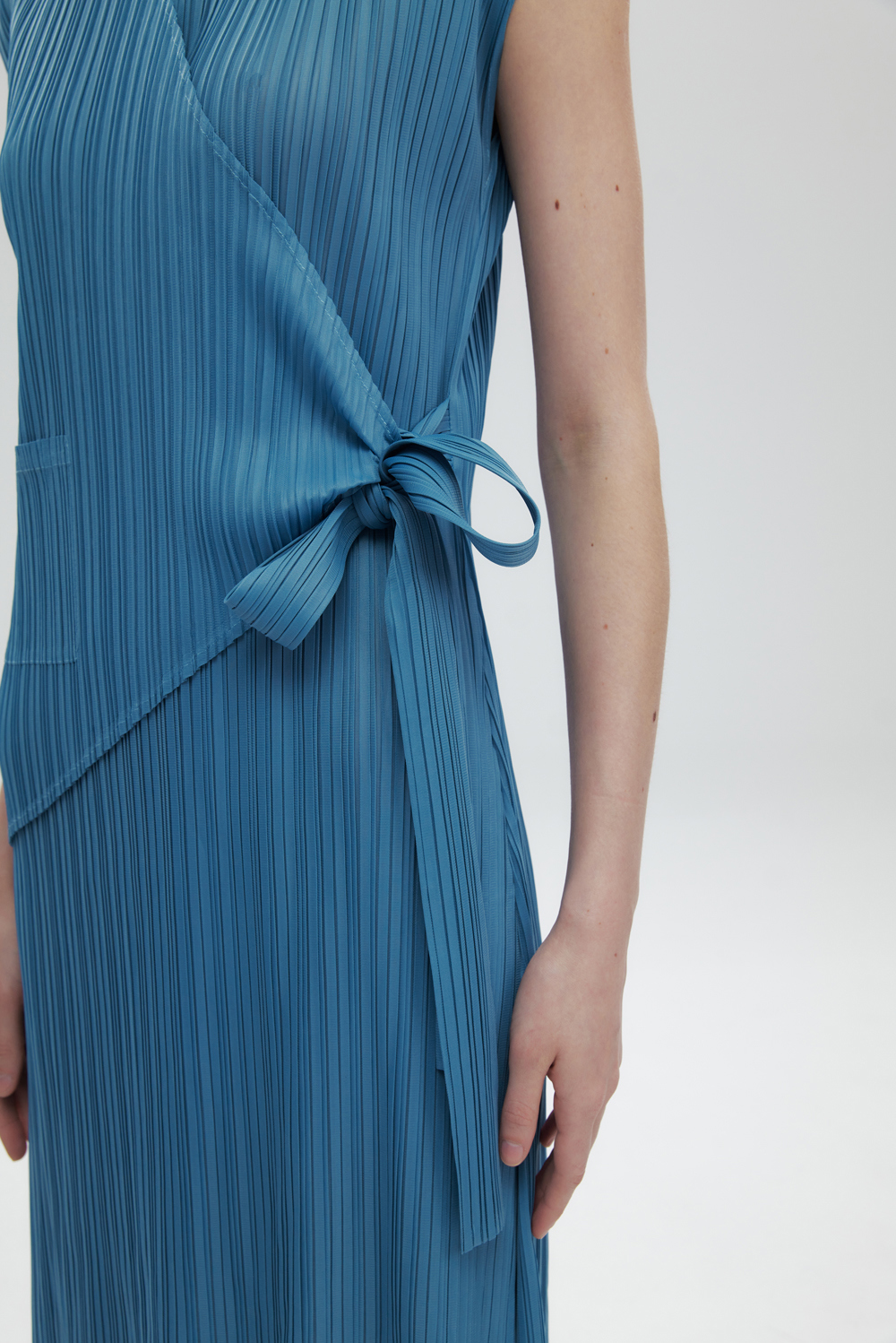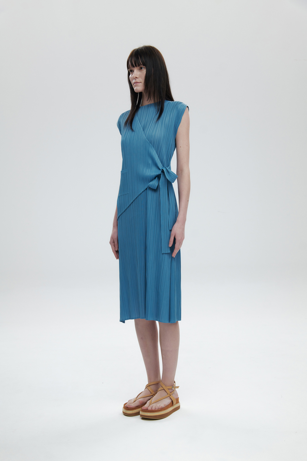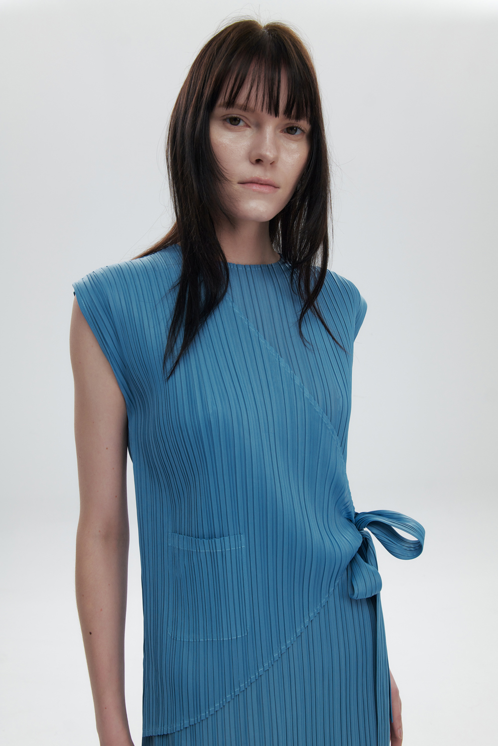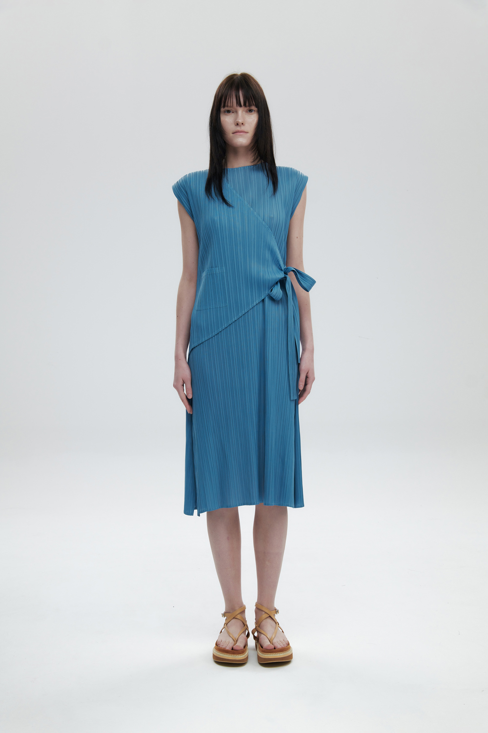 몽플리쎄 여성 타이드 랩 스타일 캡소매 플리츠 원피스 블루