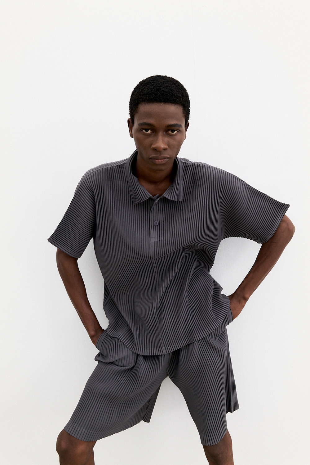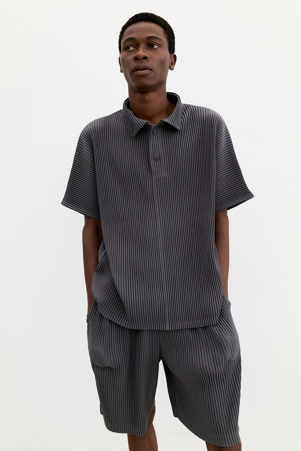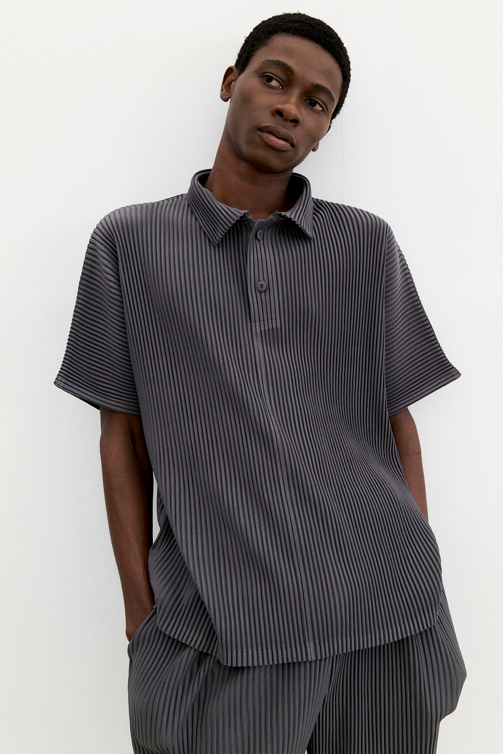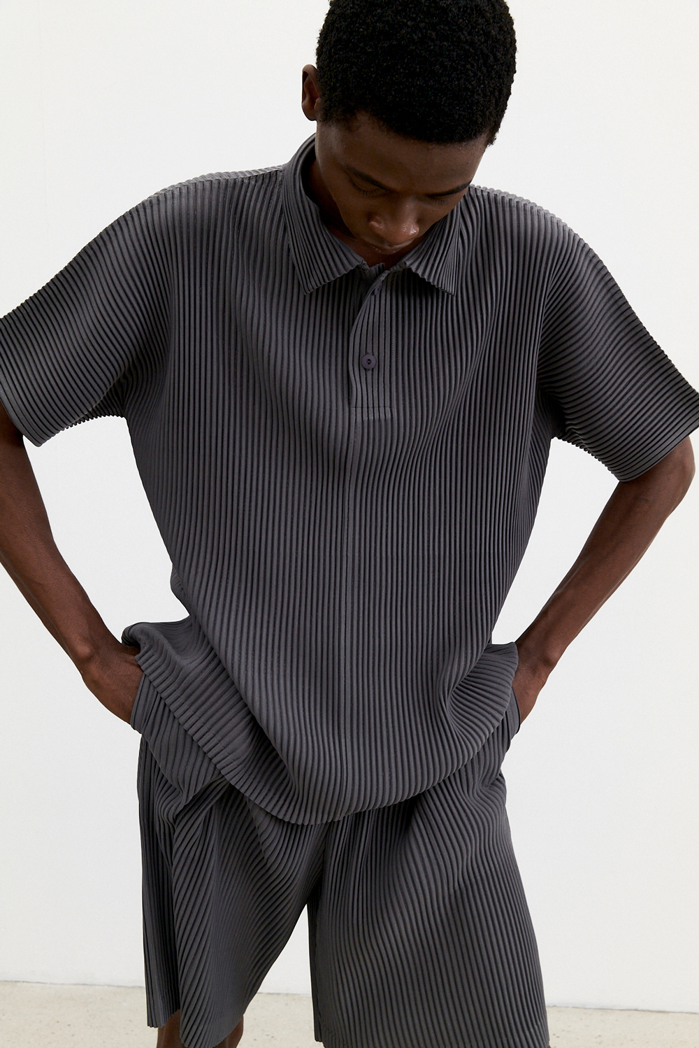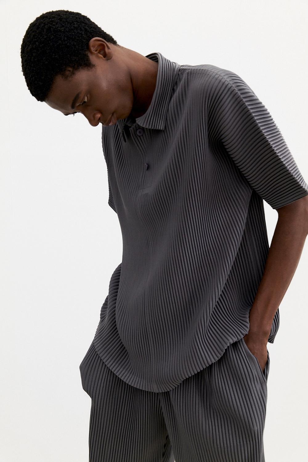 몽플리쎄 공용 카라넥 반소매 플리쎄 티셔츠 그레이