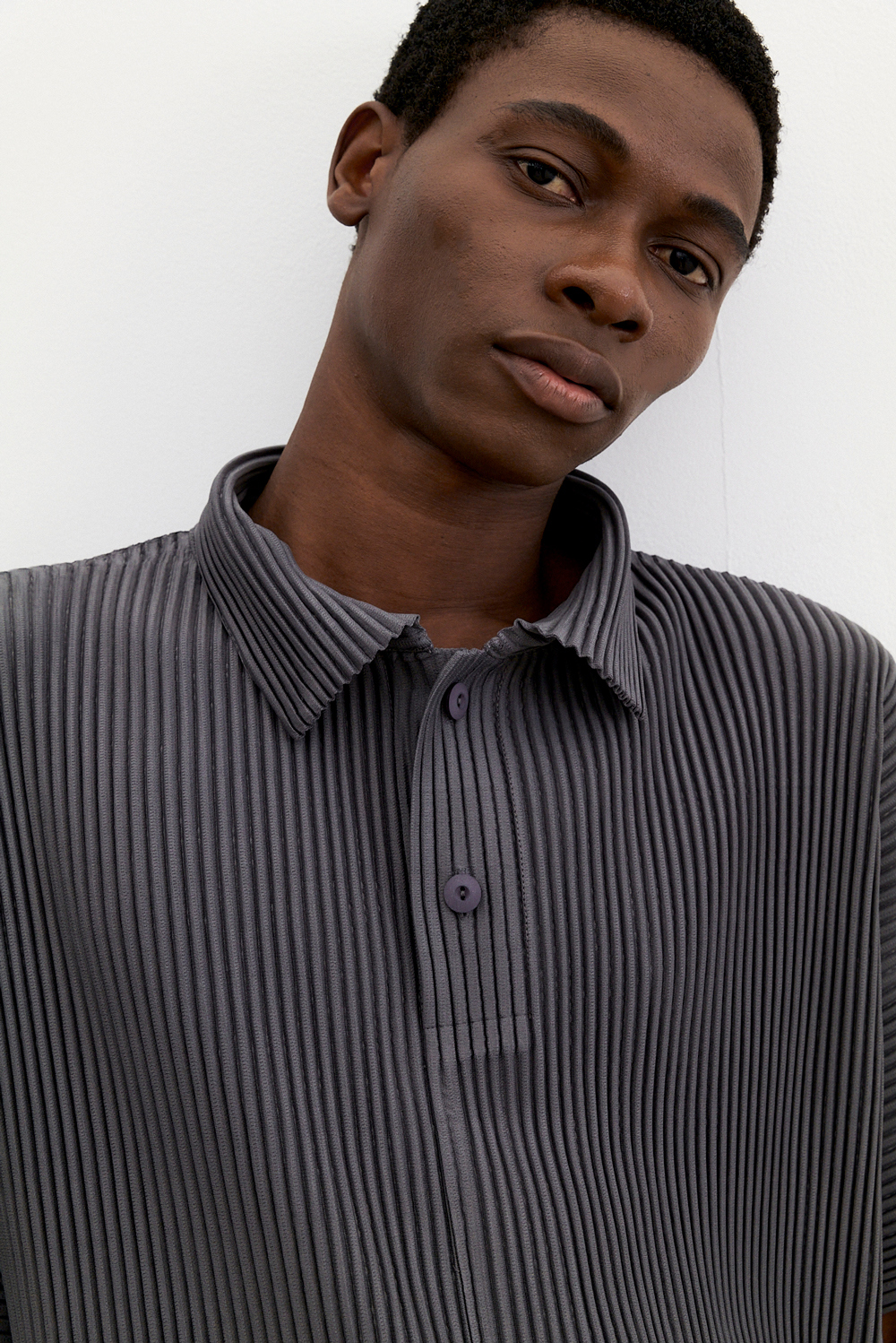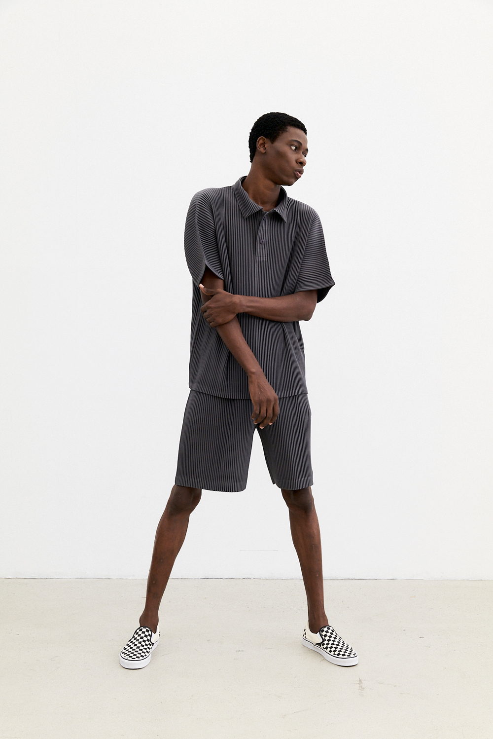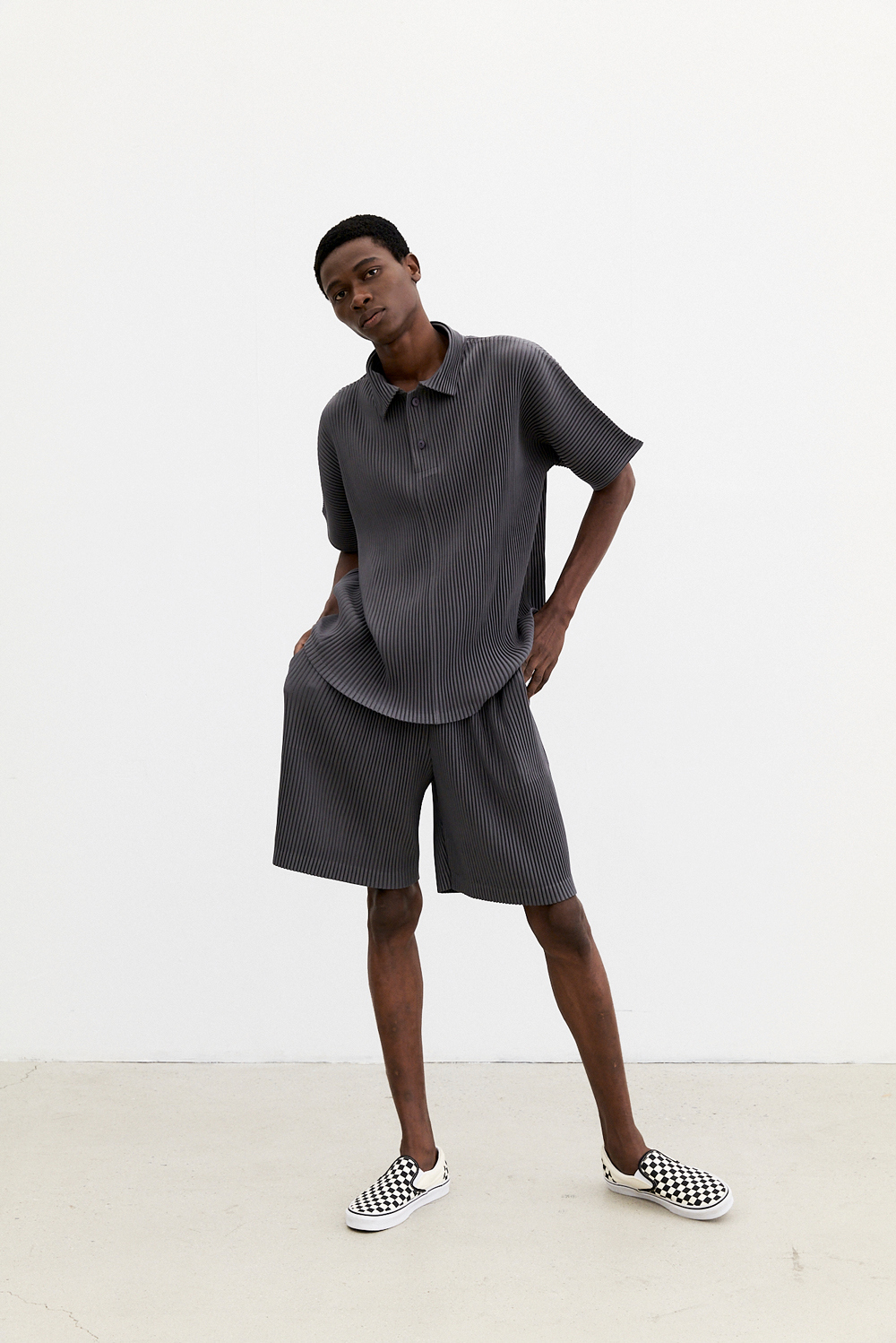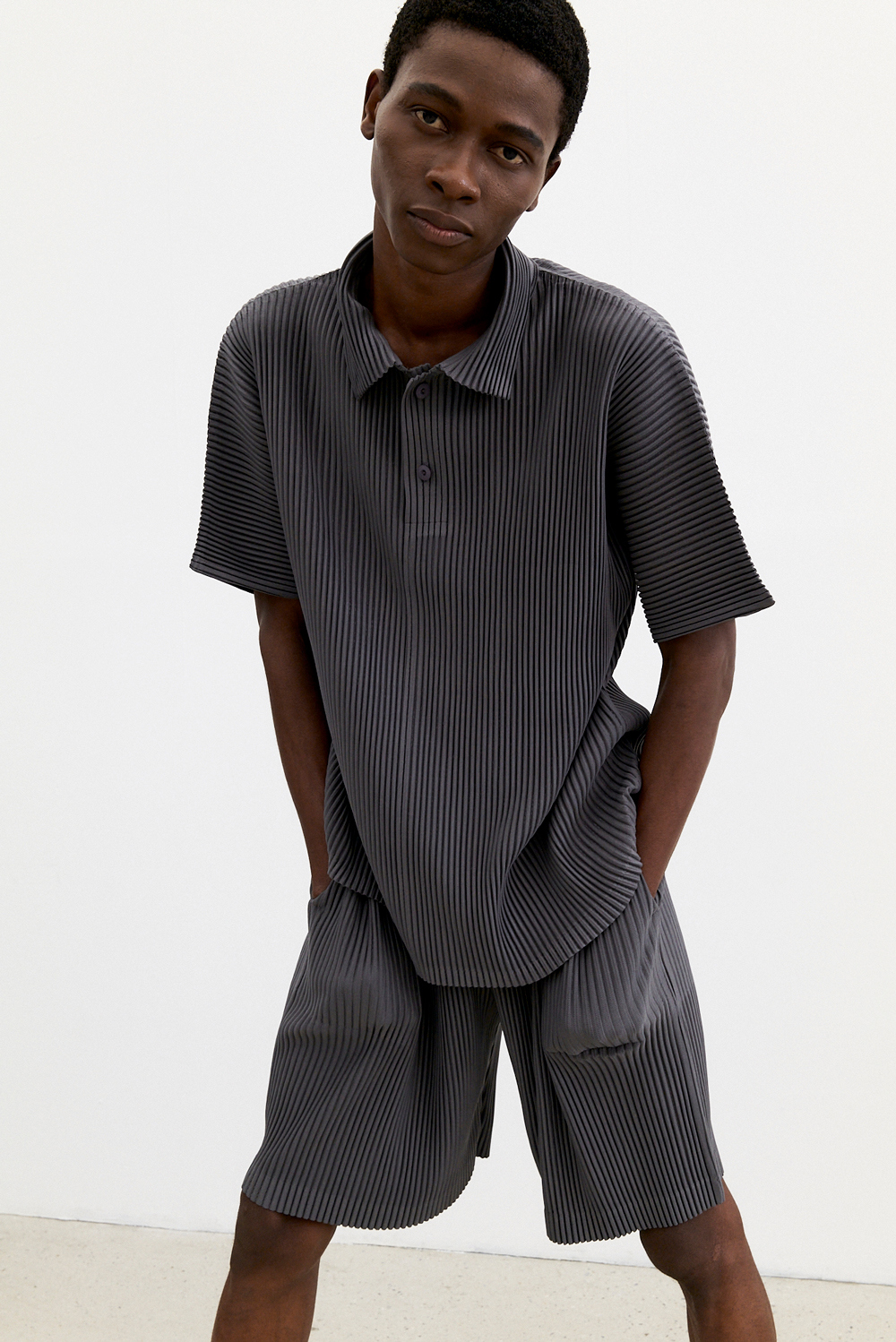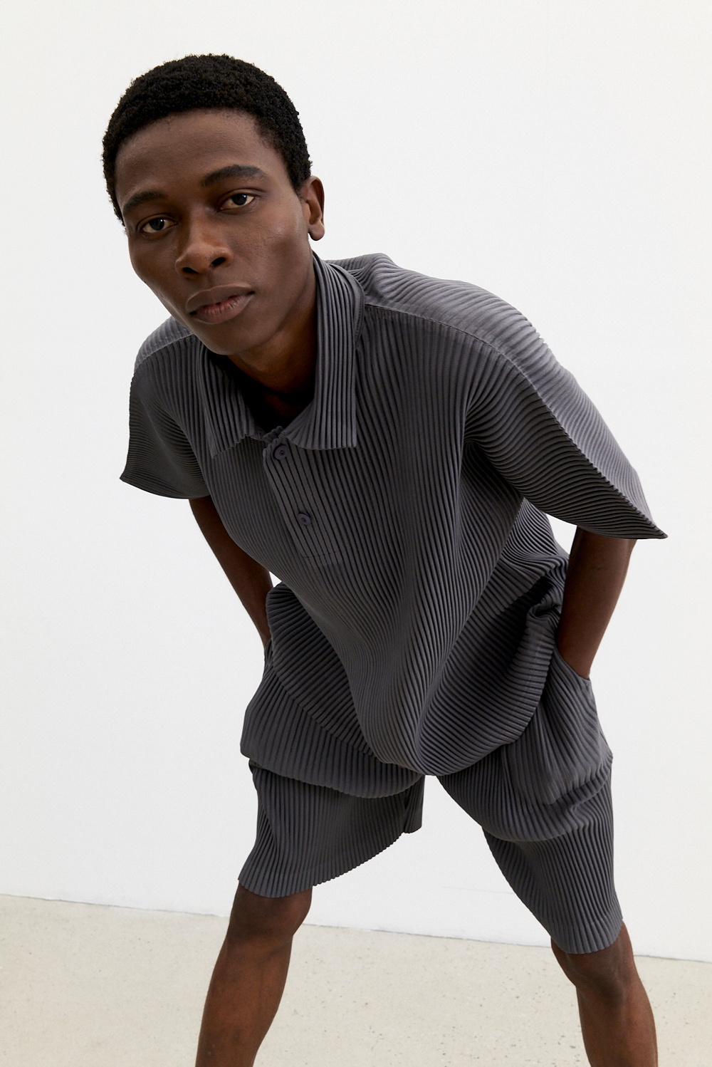 몽플리쎄 공용 카라넥 반소매 플리쎄 티셔츠 그레이