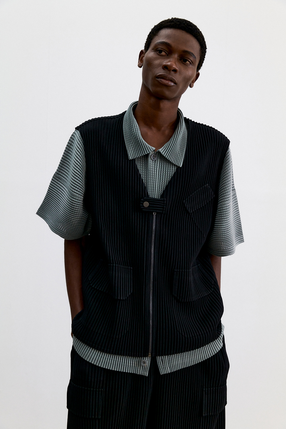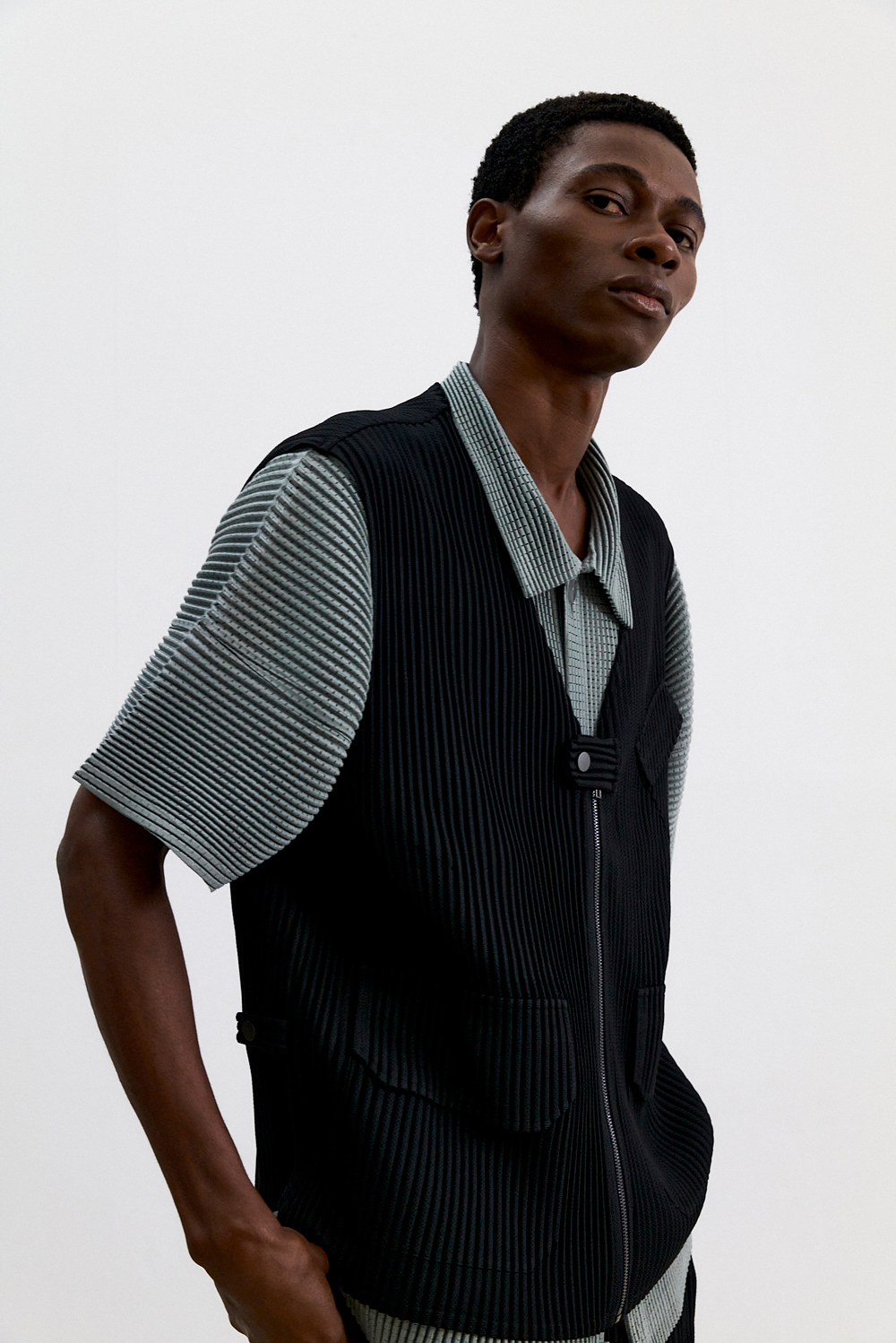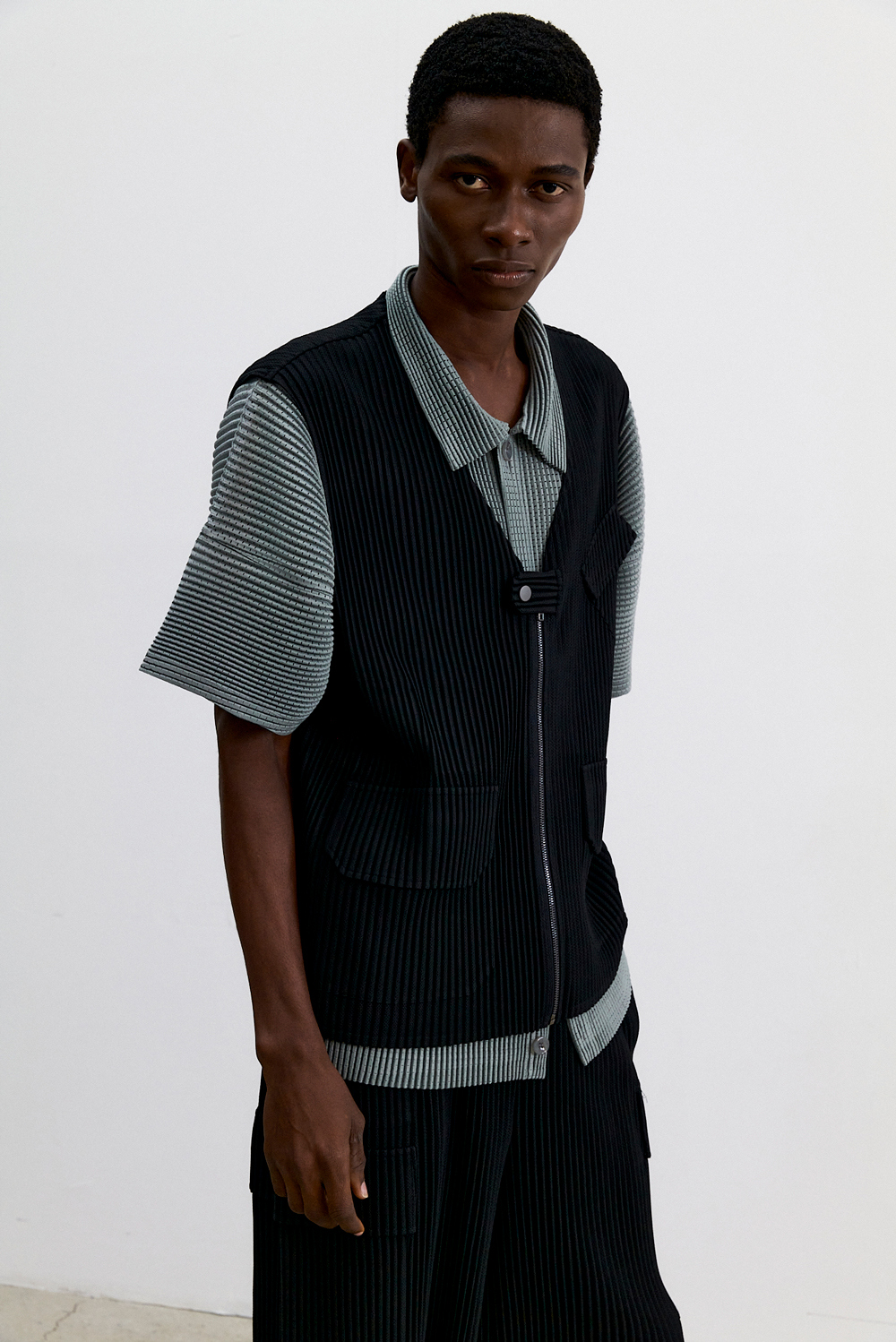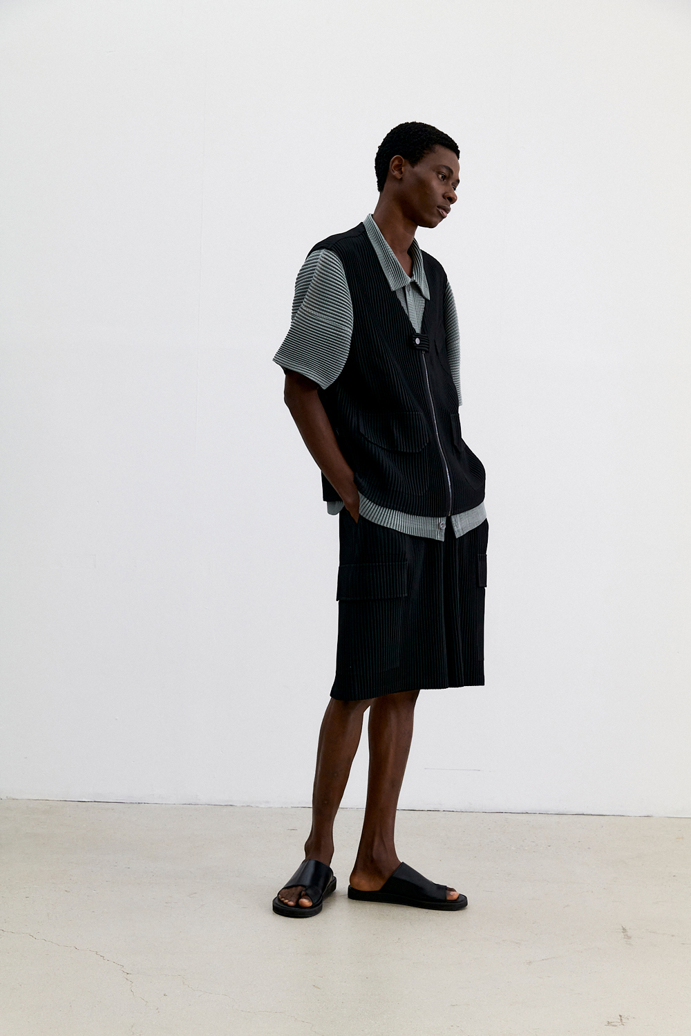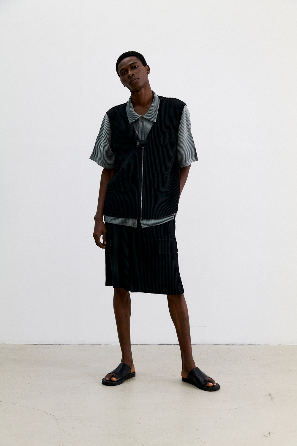 몽플리쎄 남성 유틸리티 아웃 포켓 플리츠 베스트 블랙