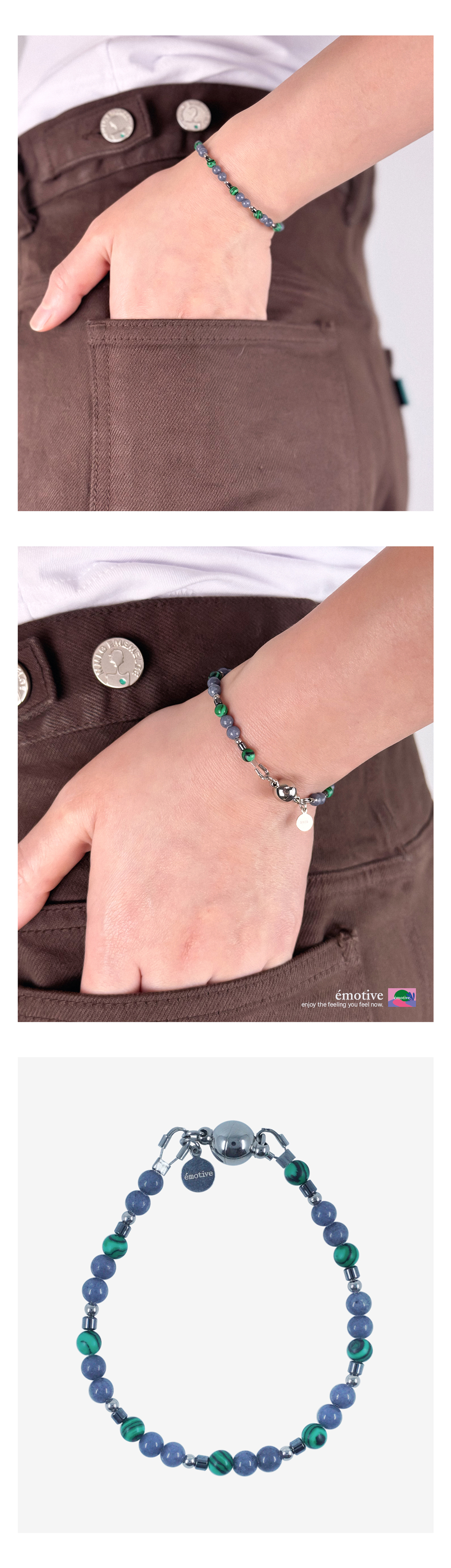 말라카이트, 딥그레이 마산옥, 헤마타이트 원석 캐주얼하고 키치한 무드 연출 서지컬 자석 마감으로 착용하기 편리함 * 서지컬 자석 착용으로 한 사이즈 업 하는것을 추천 합니다. (XL이상은 문의 주세요) - Material : 말라카이트+마산옥+헤마타이트+surgical - Size : 모델 S 착용 / 마산옥 5mm / 말라카이트 4mm / 헤마타이트 2mm