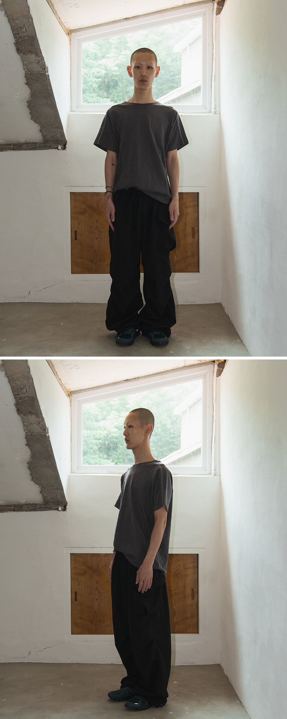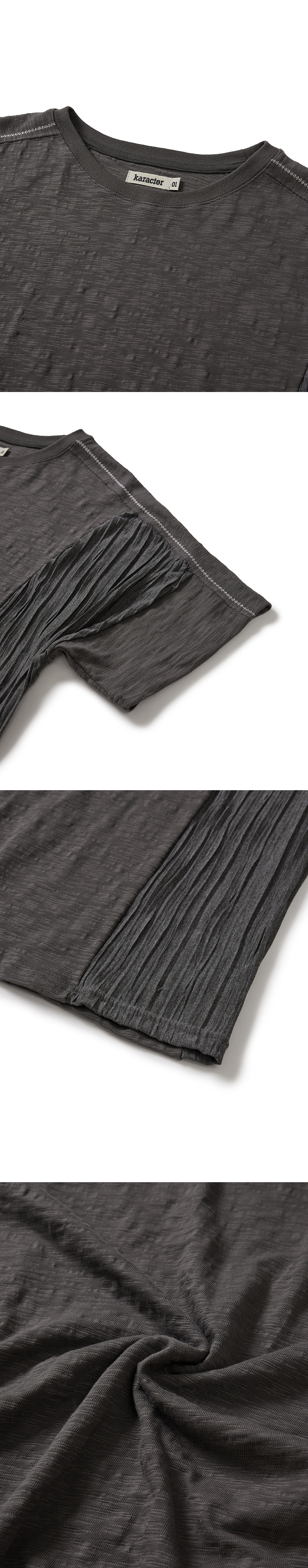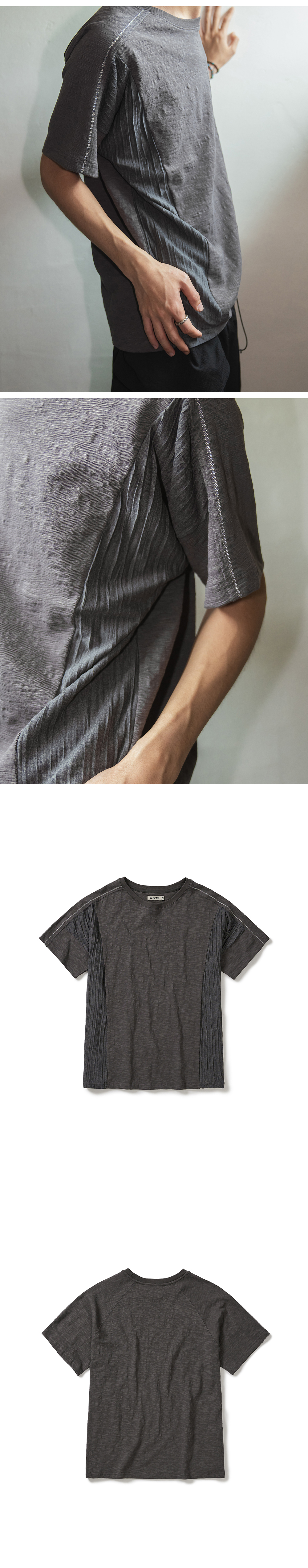 Product Info. - 빈티지한 슬러브 조직의 10's 코튼 소재로 제작된 크루넥 하프 티셔츠 - 바이오 가공을 거쳐 소프트한 스킨십과 유즈드 한 텍스처의 패브릭 - 편안한 착용감의 릴렉스드 핏 실루엣 - 러프한 셔링 텍스처 소재를 믹스한 사이드 패널 디자인 - 패브릭의 특성을 활용한 독특한 패널 구조의 프런트 슬리브 - 백 래글런 슬리브 패턴으로 자연스럽게 떨어지는 숄더 라인 - 프런트 숄더 라인 감각적인 자수 포인트