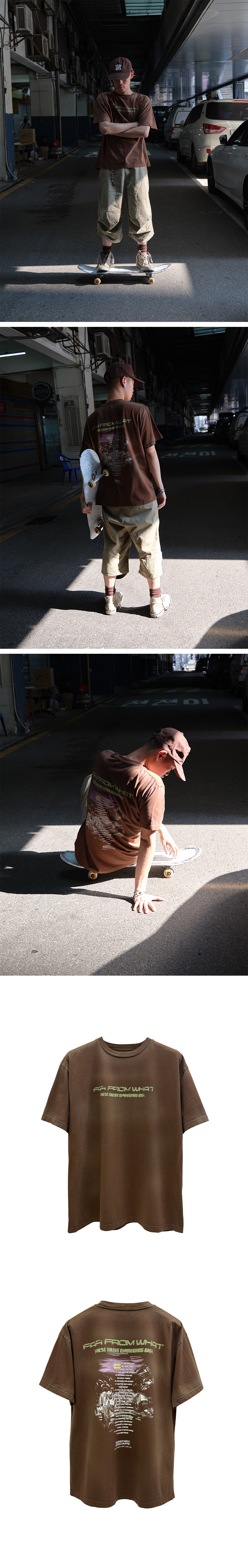 프론트에 FAR FROM WHAT 로고와 슬로건을 배치하고, 백 라인에는 투어 티셔츠 무드를 담은 그래픽을 더한 티셔츠입니다. 워싱된 바디 컬러와 빈티지한 프린트가 자연스럽게 어우러져 거친 스트릿 무드를 완성합니다. 단독 또는 레이어드 스타일링에 모두 적합합니다.