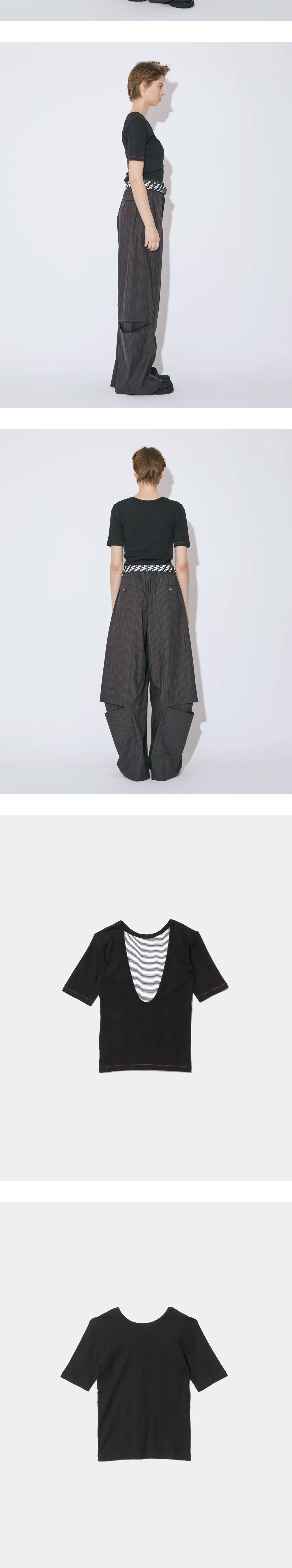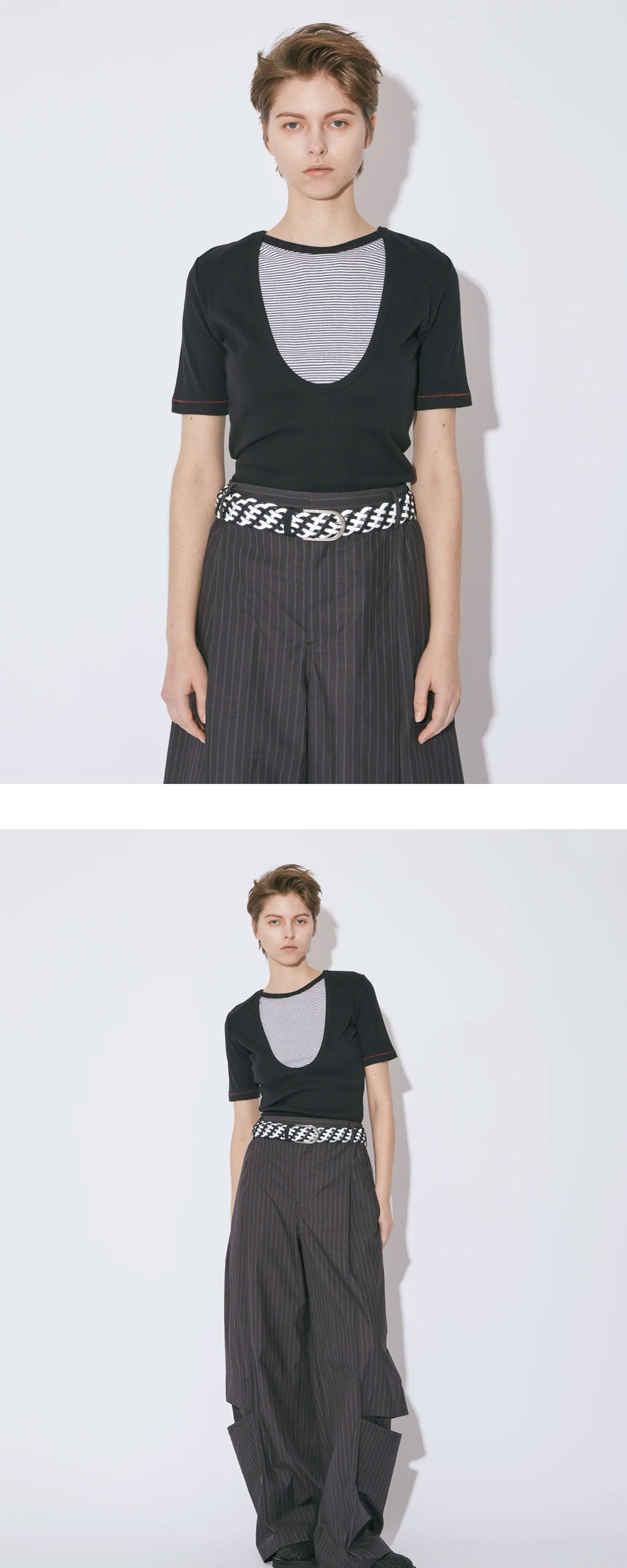 Robert P. Miller와 협업한 3중 구조 디자인의 유니크한 뷰티풀피플의 더블 프론트 티입니다. -넥라인 2WAY 연출 -앞판과 뒷판 사이에 또 하나의 판을 덧댄 3중 구조 디자인 -중간 판을 통해 팔을 넣어 착용하면, 마치 크루넥 톱을 레이어드한 듯한 스타일 연출 가능 -배색 바인더 디테일 포인트 -핏한 실루엣 -힙 위까지 오는 기장감