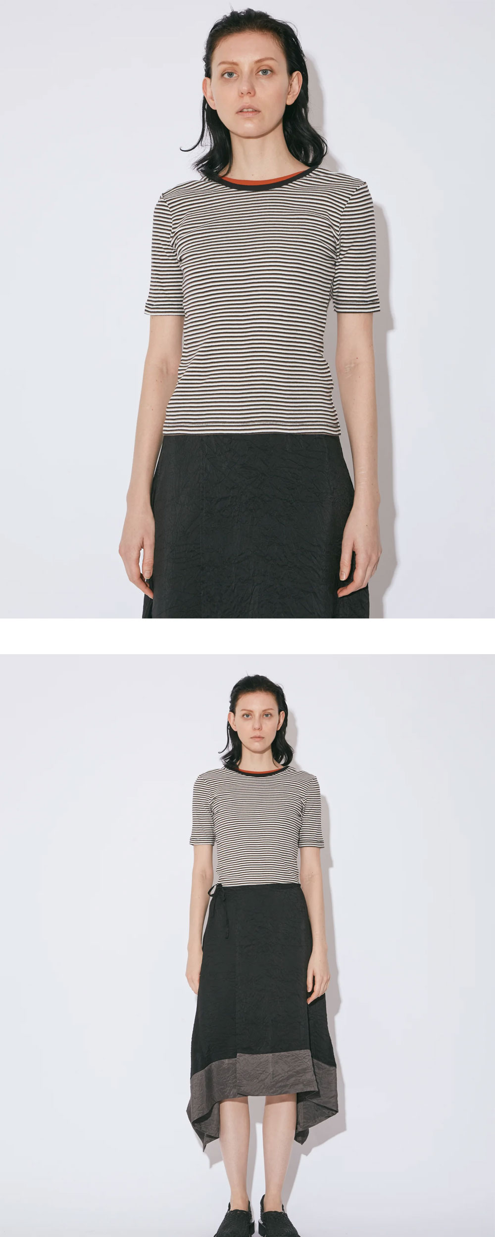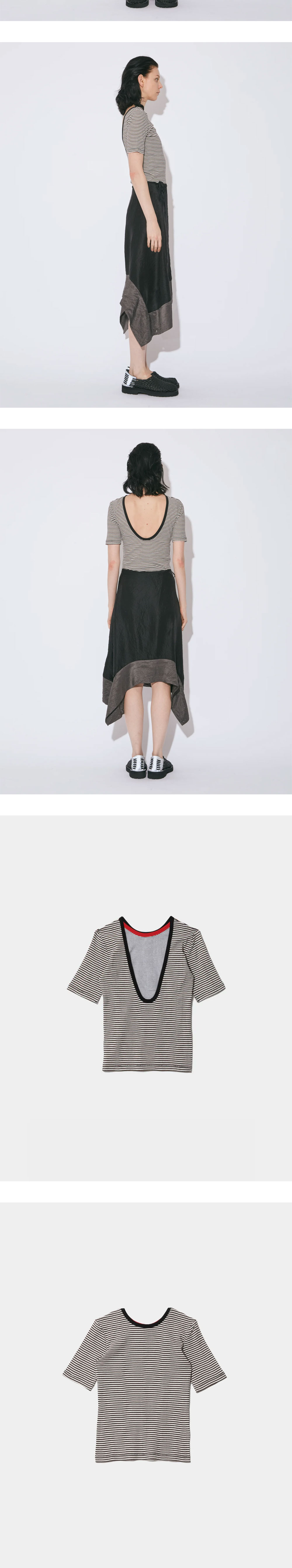 Robert P. Miller와 협업한 3중 구조 디자인의 유니크한 뷰티풀피플의 더블 프론트 티입니다. -넥라인 2WAY 연출 -앞판과 뒷판 사이에 또 하나의 판을 덧댄 3중 구조 디자인 -중간 판을 통해 팔을 넣어 착용하면, 마치 크루넥 톱을 레이어드한 듯한 스타일 연출 가능 -배색 바인더 디테일 포인트 -핏한 실루엣 -힙 위까지 오는 기장감