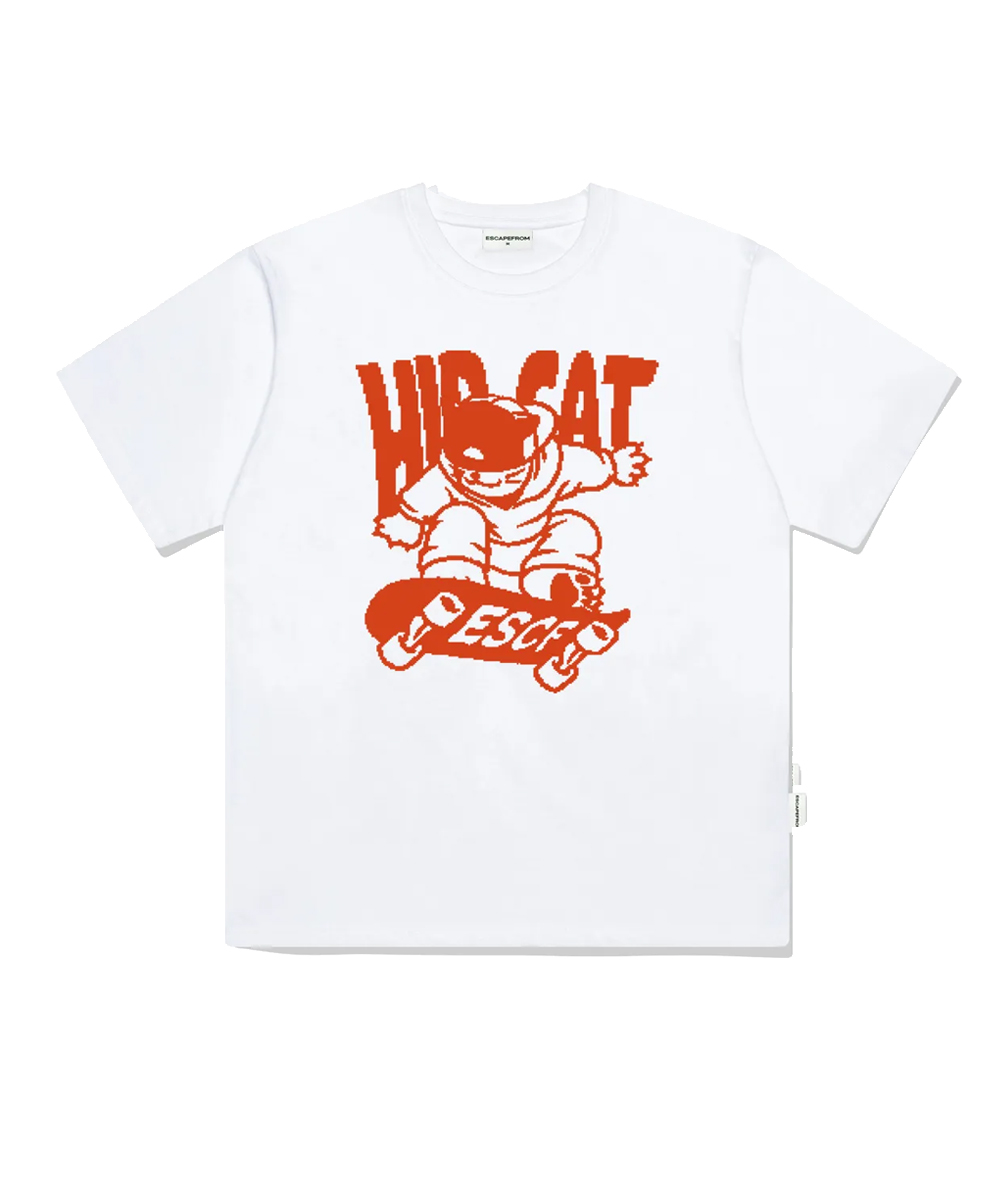 Escapefrom Orange Hip Cat Skateboard Print Overfit Short Sleeve T-shirt White