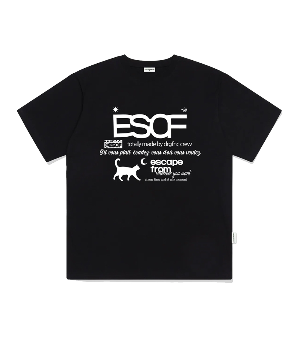 이스케이프프롬 화이트 키티 크루 컬렉션 프린트 오버핏 반팔티 블랙