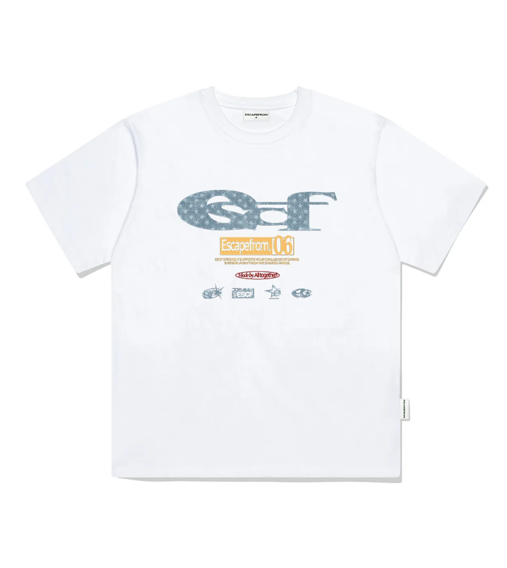 이스케이프프롬 블루 별 데님 ESCF 로고 콜라주 프린트 오버핏 반팔티 화이트