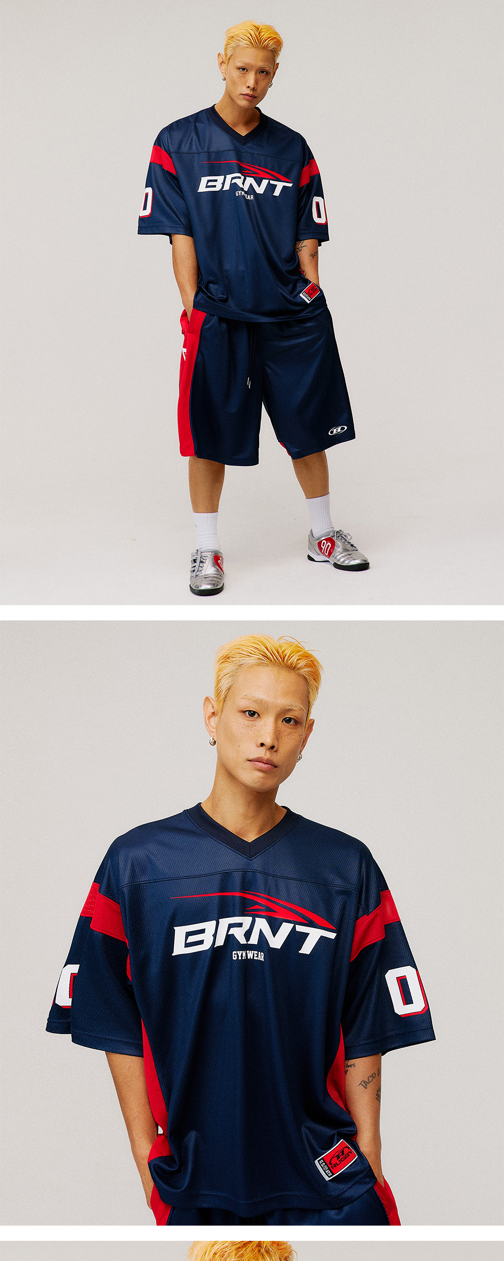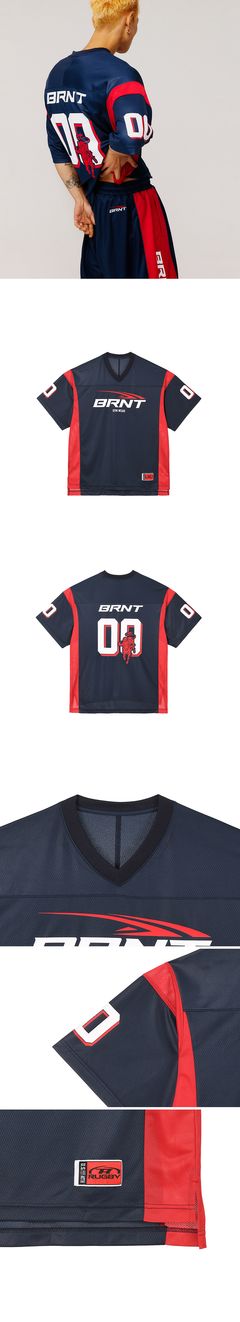 [DETAILS] * 메쉬 풋볼 저지 티셔츠 - 흡습속건 메쉬 원단 - V넥 디테일 - 그래픽 로고 포인트 - 배색 디테일 - 엑스트라 사이즈 Material : Polyester 100% Fitting : DS 1 Size, 178cm, 70kg