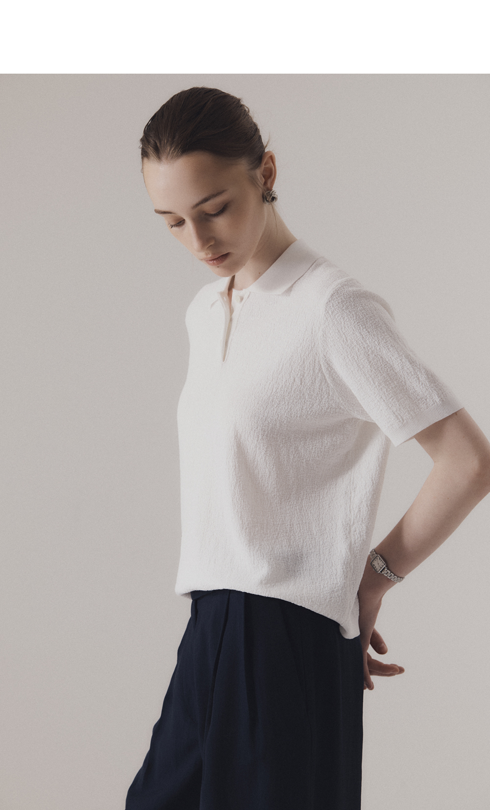 차르르하게 흐르는 실루엣과 부드러운 착용감이 특징인 반팔 니트 폴로입니다. 비스코스, 텐셀 혼방사로 편직되어 피부에 닿는 터치감이 매끄럽고 시원합니다. 잔잔한 텍스처가 잡힌 스타일의 표면감이 돋보이며, 소매와 밑단에는 립 조직을 더해 단정한 마무리감과 형태 안정성을 높였습니다.
