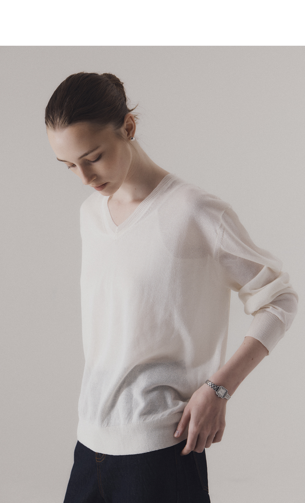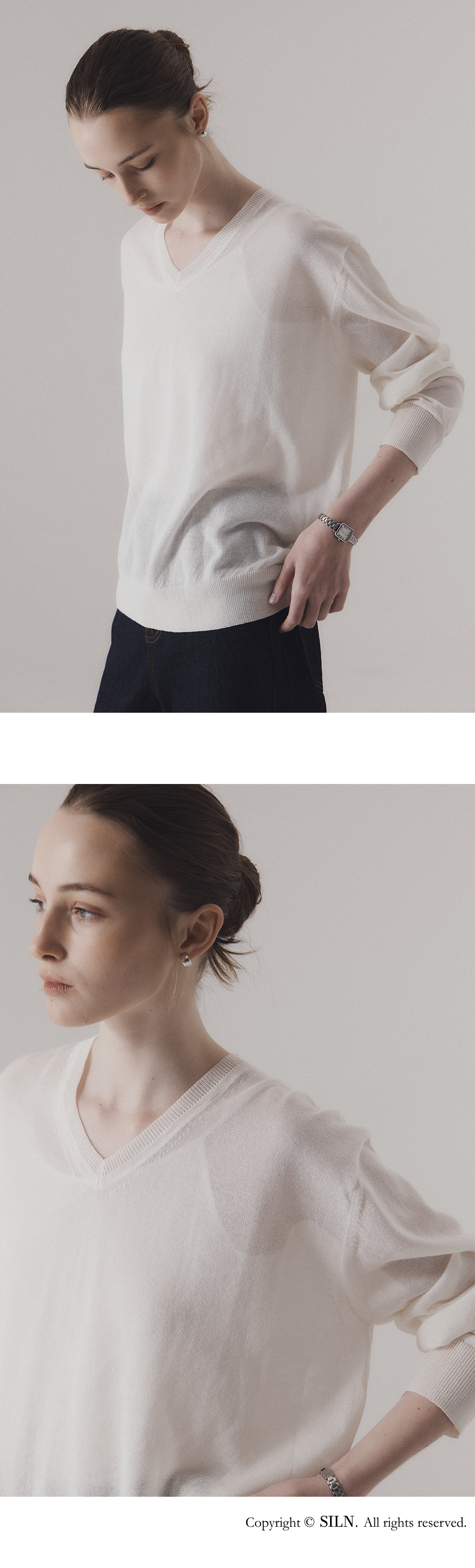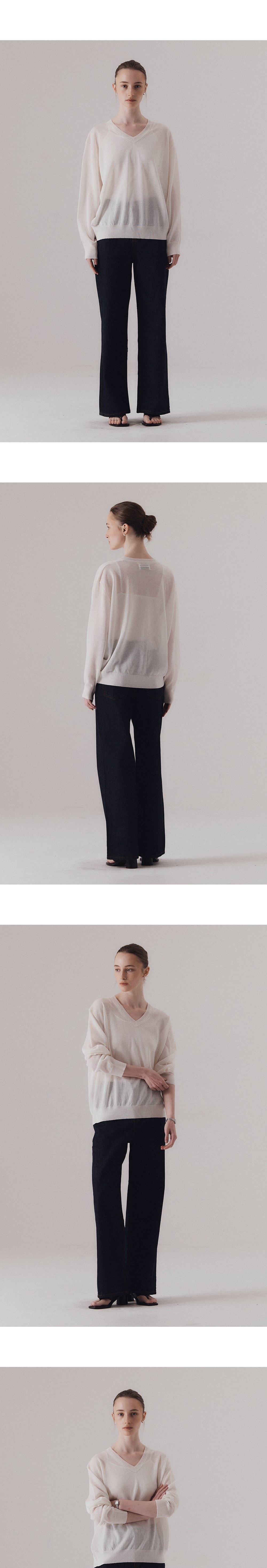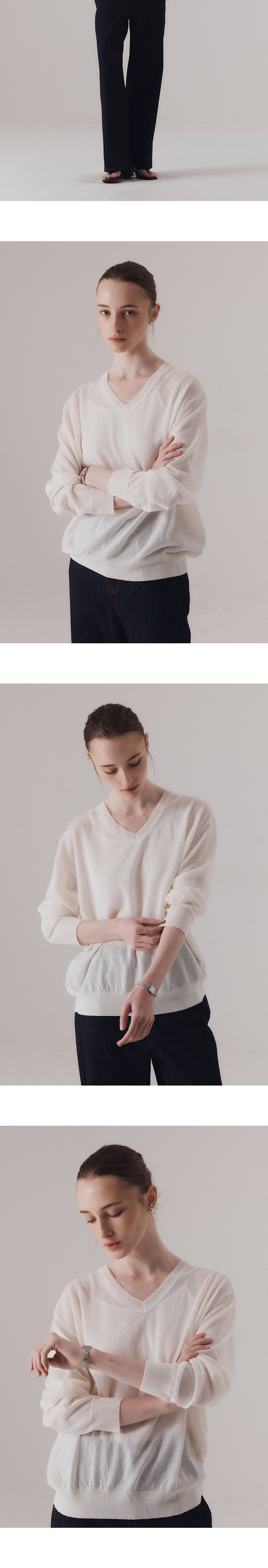 은은한 비침이 돋보이는 세련된 v-neck 니트입니다. 가볍고 통기성 좋은 텍스처로 편직하여 사계절 일상에서 다양하게 활용하기 좋은 니트입니다. 단독 착용은 물론 이너와 레이어드하여 다양한 연출이 가능합니다. 하의 Non-fade classic indigo wide denim (INDIGO)를 착용하였습니다.