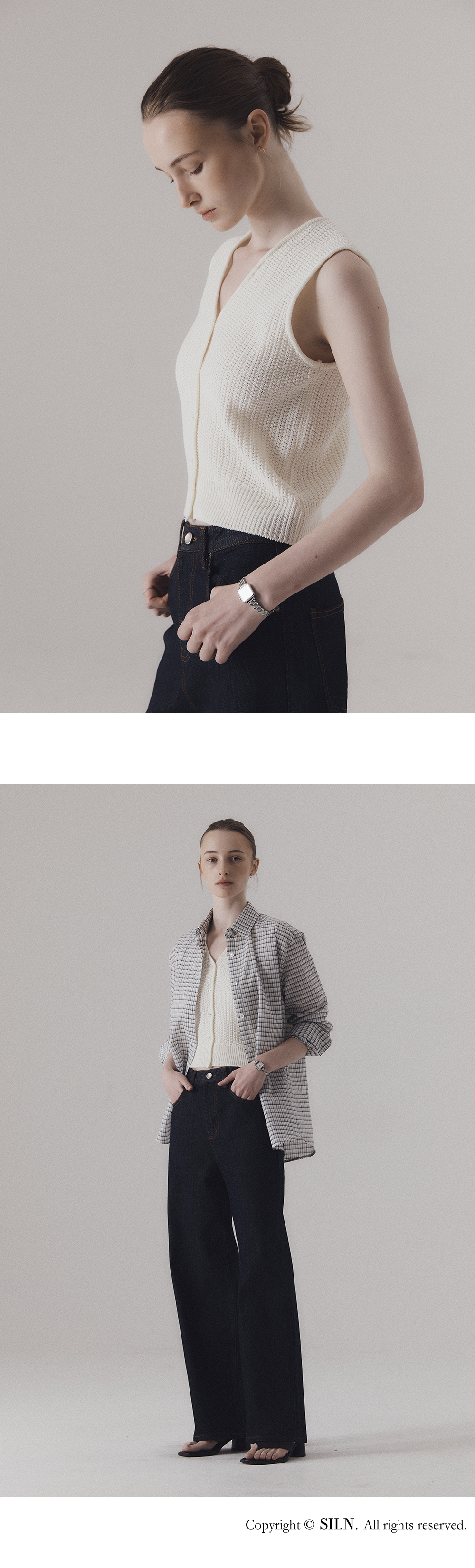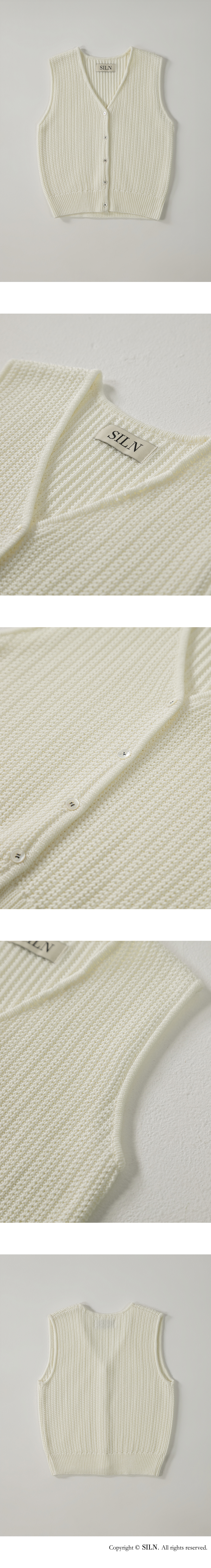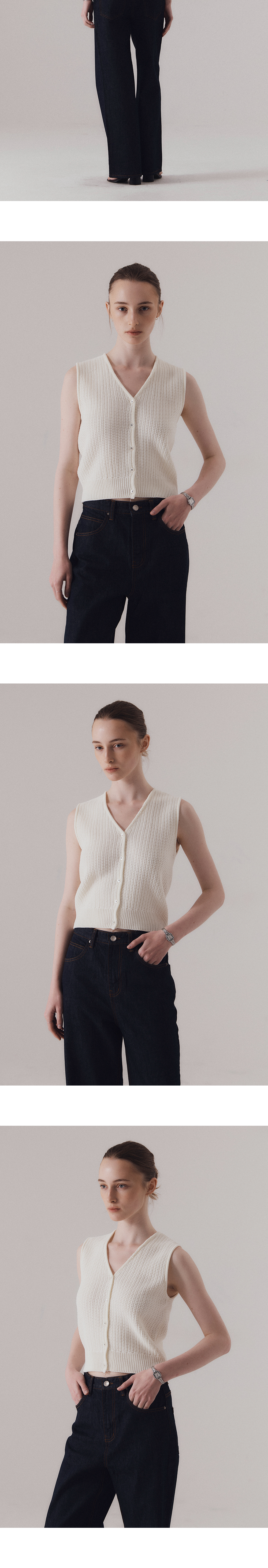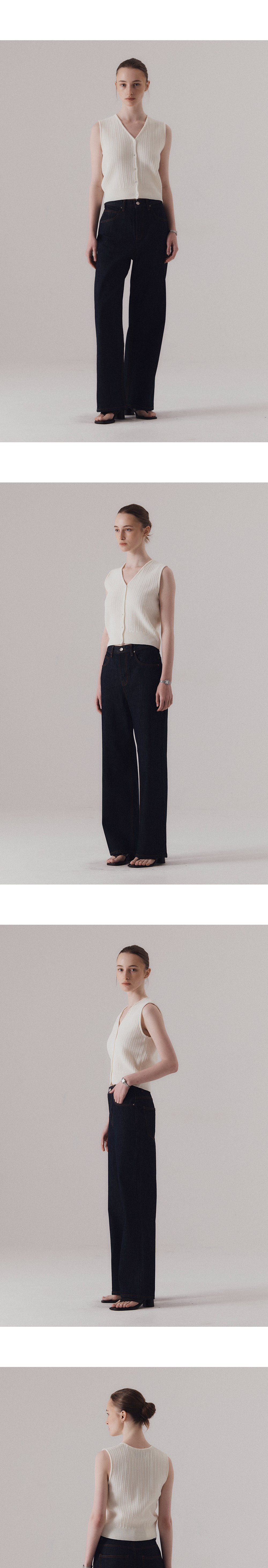 단정한 v-neck 라인과 짜임이 돋보이는 니트 베스트입니다. 탄탄한 짜임과 적당한 두께감으로 봄부터 가을까지 활용하기 좋은 아이템입니다. 버튼을 모두 채워 포멀하게, 또는 오픈해서 캐주얼하게 레이어드할 수 있어 스타일에 따라 다양하게 연출 가능합니다. 하의 Non-fade classic indigo wide denim (INDIGO)를 착용하였습니다.