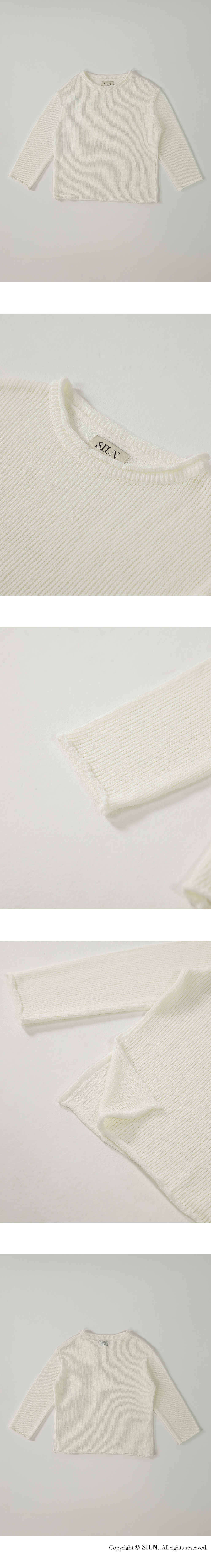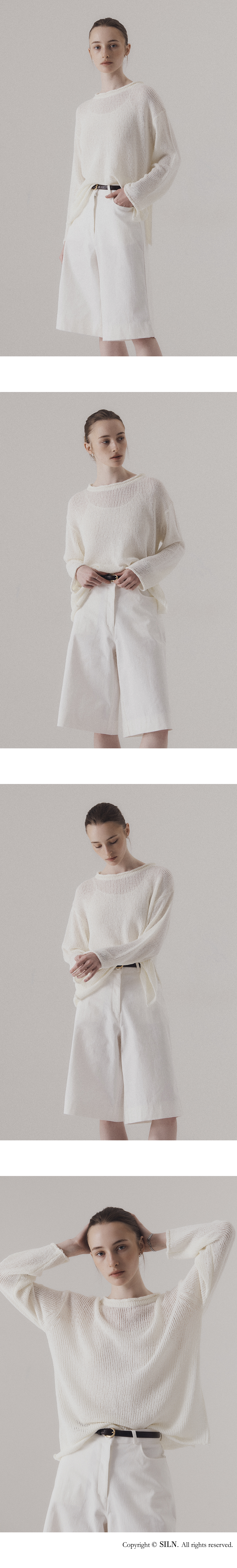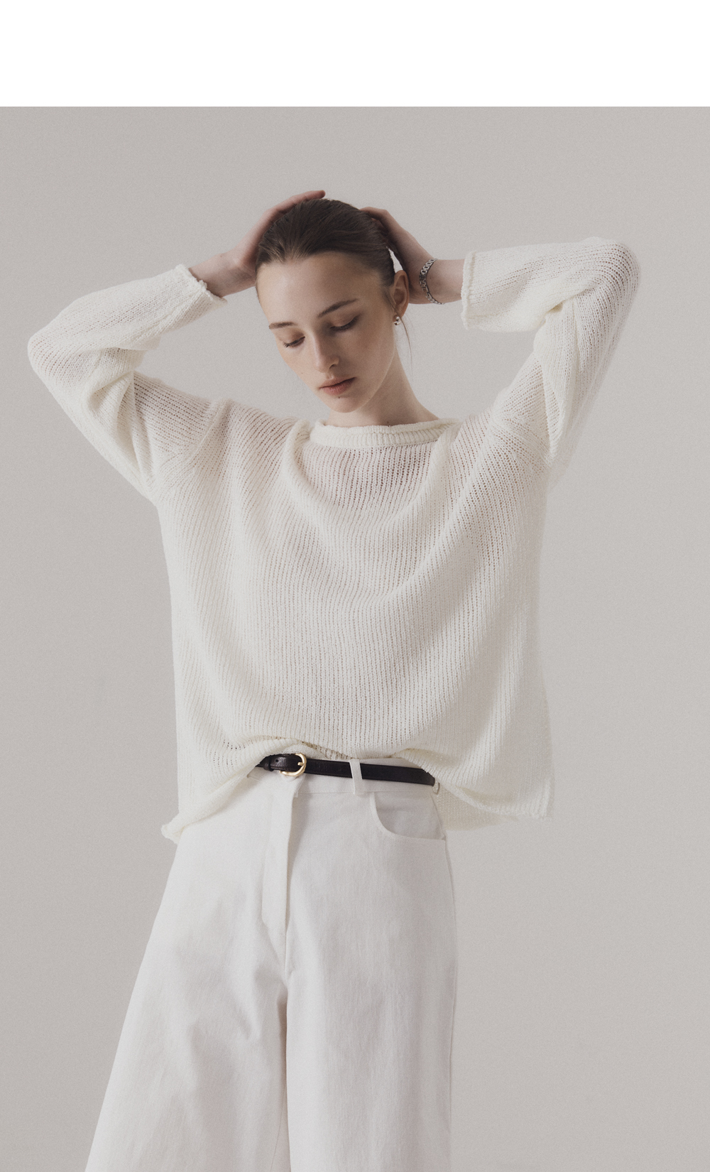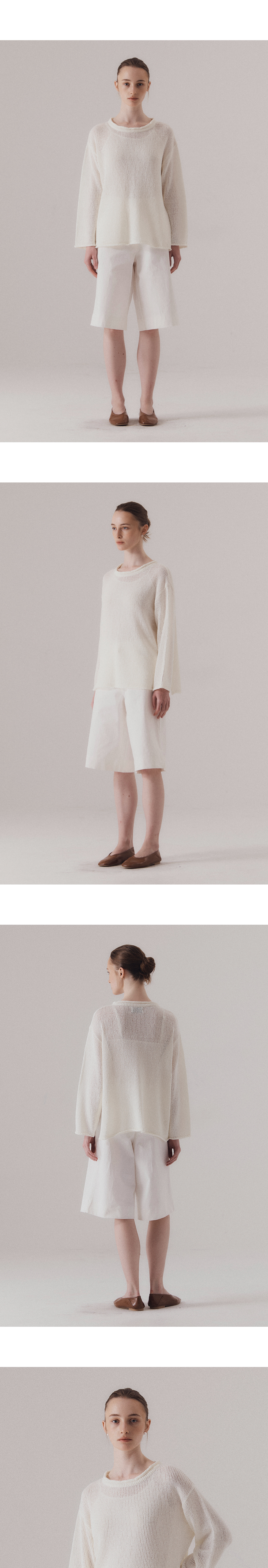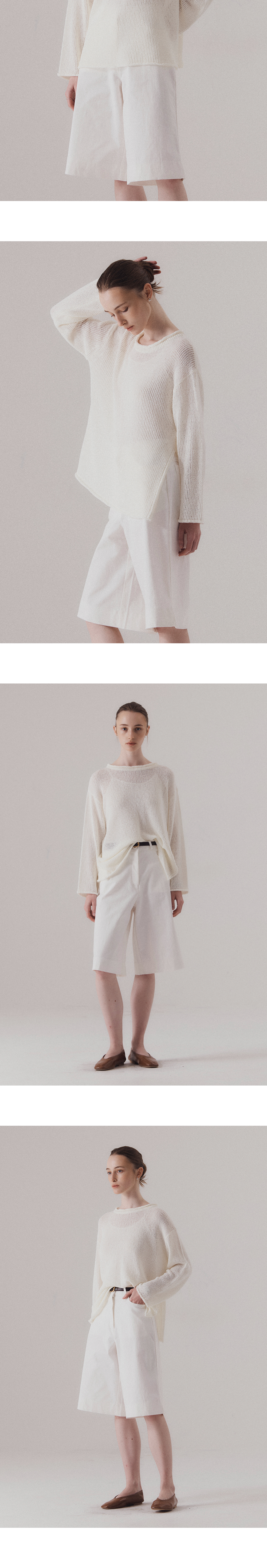 네크라인,밑단,소매단에 자연스럽게 말린 듯한 디테일을 더하였습니다. 가볍고 통기성 좋은 텍스처로 편직하여 사계절 일상에서 다양하게 활용하기 좋은 니트입니다. 착용 시 왼쪽 옆선에 더해진 슬릿 디테일로 편안한 움직임과 은은한 스타일링 포인트를 더하였습니다. 여유로운 핏감과 은은한 비침이 더해져 레이어드 연출은 물론, 단독 착용 등 다양한 연출이 가능합니다. 하의 Classic contour bermuda pants (WHITE)를 착용하였습니다.