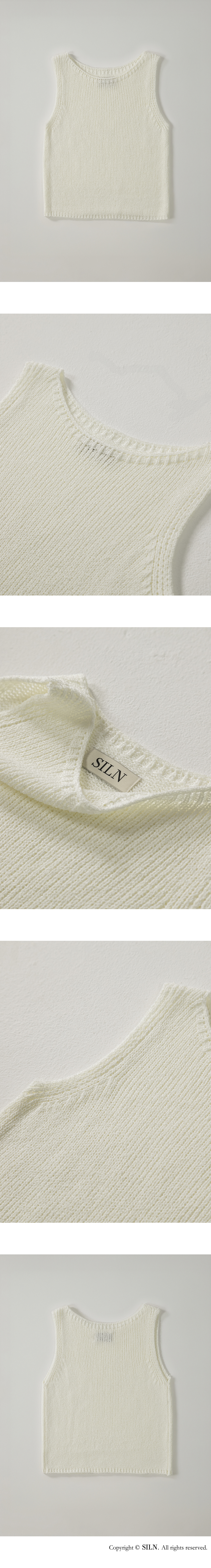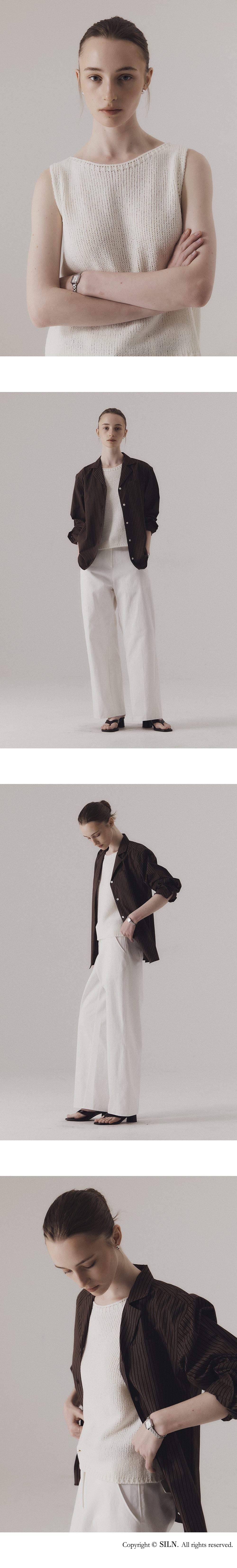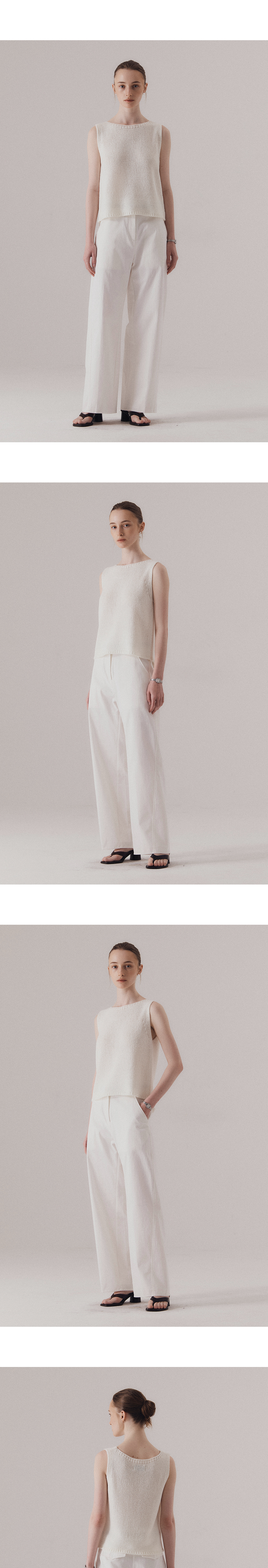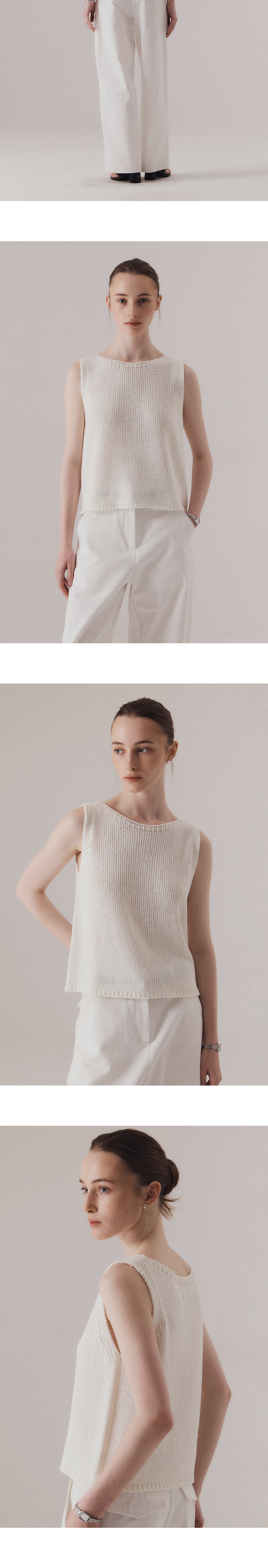 자연스럽게 흐르는 텍스처와 여유 있는 실루엣이 매력적인 니트 슬리브리스입니다. 심플한 라운드 넥과 부드럽게 떨어지는 암홀 라인이 편안한 착용감을 선사합니다. 통기성이 뛰어난 텍스처로 편직되어 무더운 날씨에도 쾌적하게 착용 가능합니다. 하의 Structure cotton chino pants (WHITE)를 착용하였습니다.