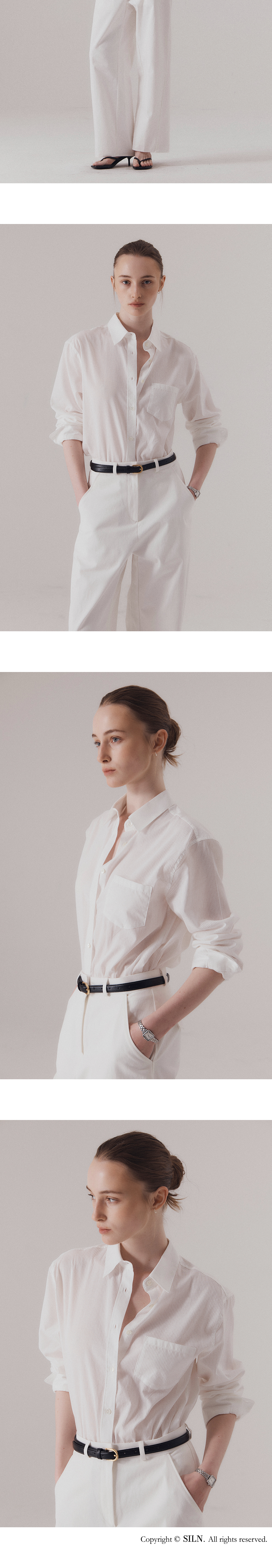 은은한 시어 텍스처 위로 섬세하게 흐르는 스트라이프 패턴이 가미된 매력적인 소재입니다. 과하지 않은 여유 있는 어깨 라인과 허리선이 자연스럽게 들어간 실루엣으로 단정하면서도 정제된 분위기를 자아냅니다. 클래식 셔츠의 정수를 담은 디자인으로, 단독으로는 물론 레이어드로 착용해도 좋은 활용도 높은 셔츠입니다. 매트하게 떨어지는 원단의 조직감이 분위기를 더하며, 시즌을 가리지 않고 활용 가능합니다. 하의 High-waist classic denim (BLUE), Non-fade classic indigo wide denim (INDIGO), Structure cotton chino pants (WHITE)를 착용하였습니다.