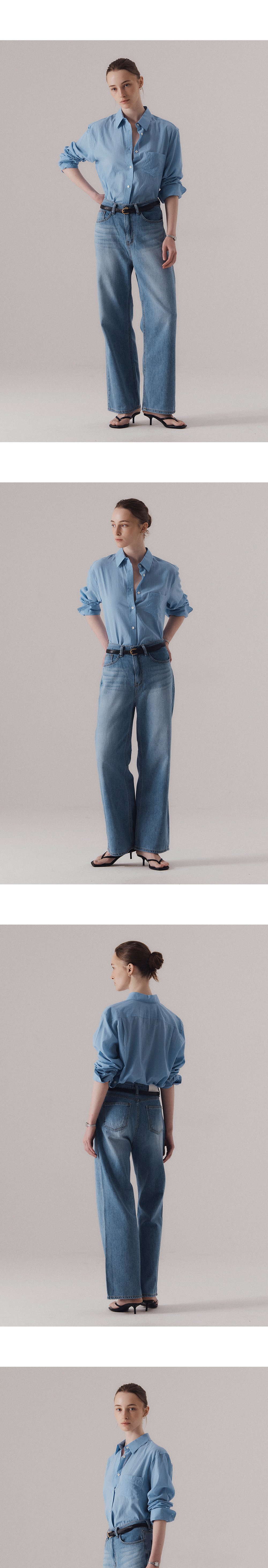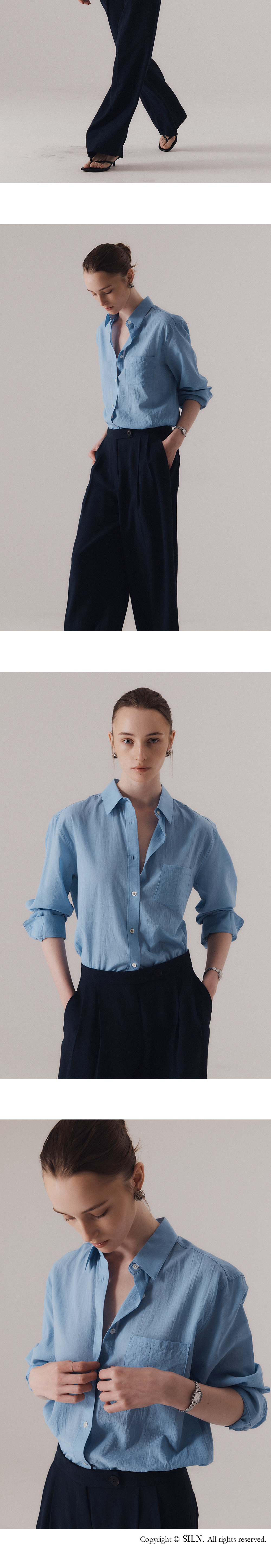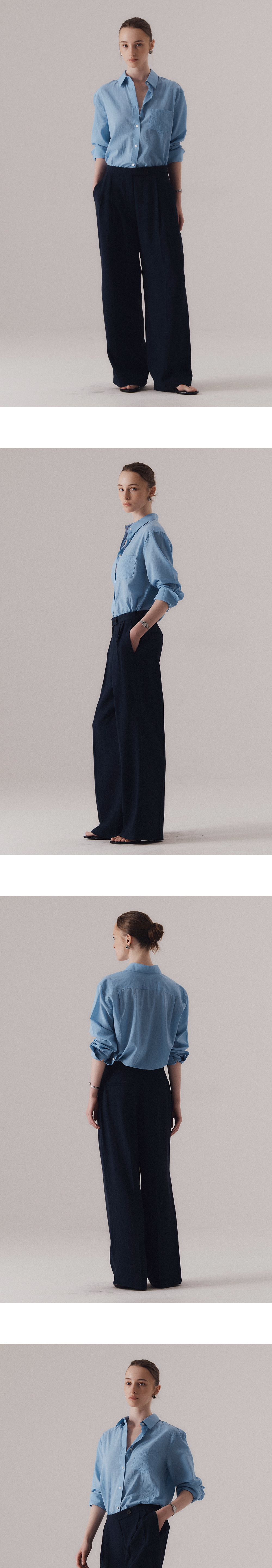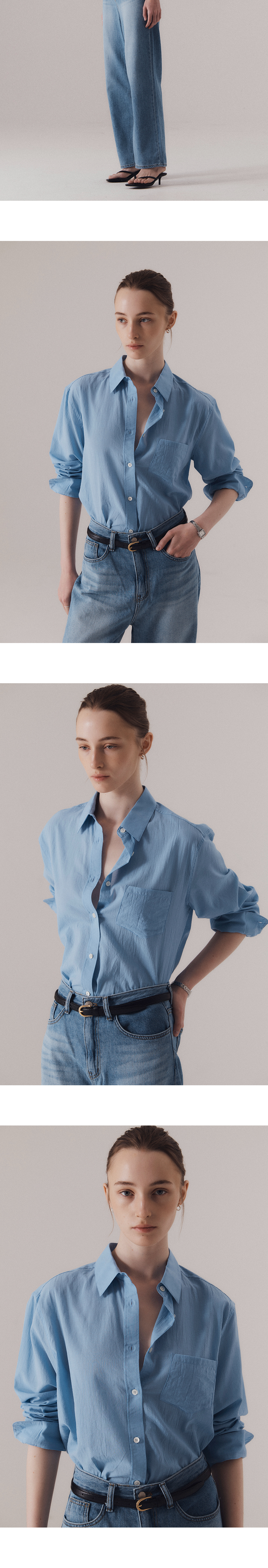 얇고 부드러운 80's 코튼 보일 원단을 사용하여, 시어한 텍스처와 함께 자연스럽게 흐르는 촉감이 인상적입니다. 아사 소재에서 느껴지는 고운 결과 은은한 투명감이 살아 있어, 클래식 셔츠임에도 섬세하고 유연한 인상을 줍니다. 과하지 않은 여유 있는 어깨 라인과 허리선이 자연스럽게 들어간 실루엣으로 단정하면서도 정제된 분위기를 자아냅니다. 부드럽게 녹아드는 블루 컬러는 피부 톤에 구애받지 않고 깔끔하게 어우러지며, 계절감을 살려줍니다. 간결하지만 단조롭지 않은, 클래식 셔츠의 본질을 시어한 소재 위에 섬세하게 담아낸 셔츠입니다. 하의 High-waist classic denim (BLUE)를 착용하였습니다.