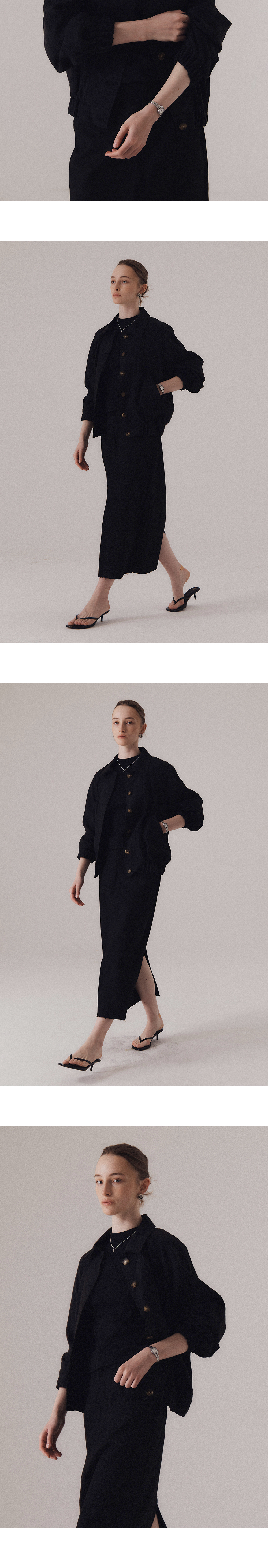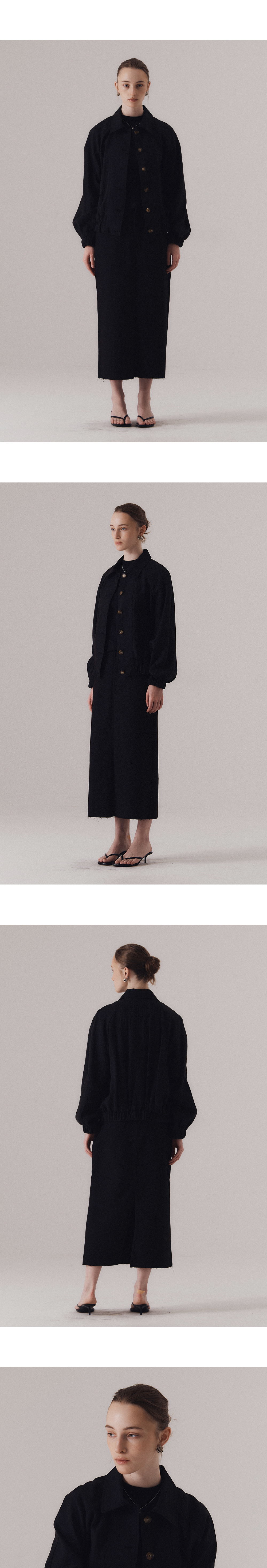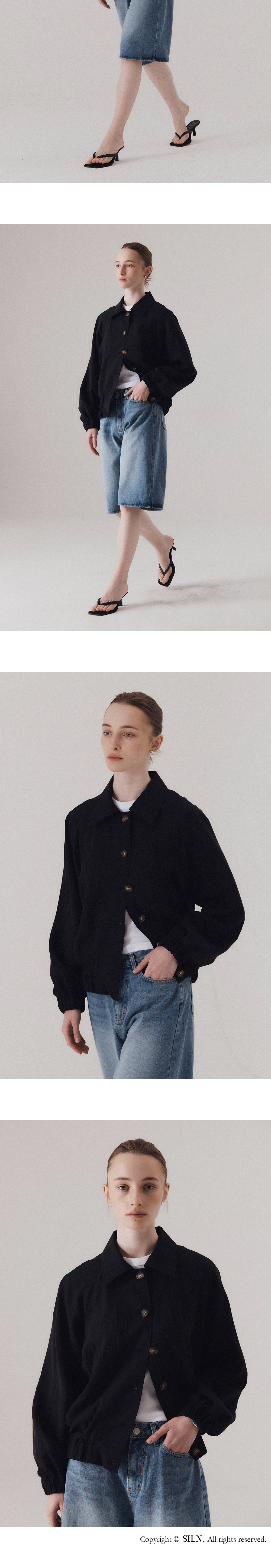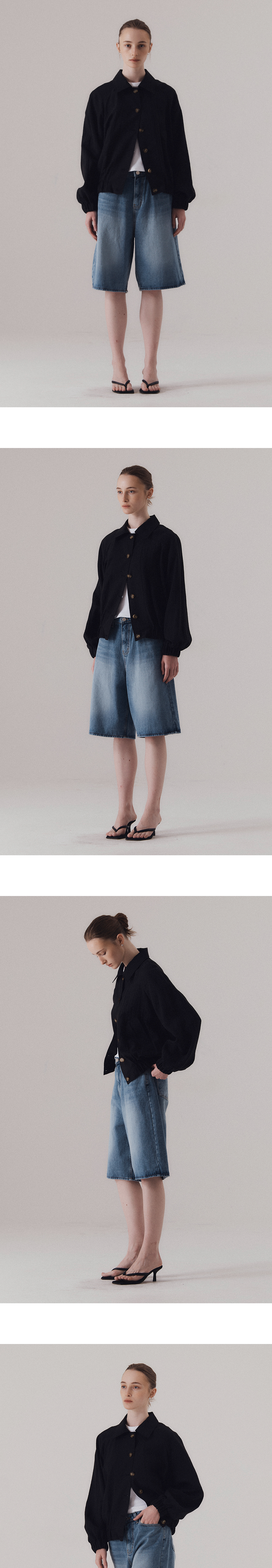 얇고 통기성 좋은 원단으로 제작되어 피부에 달라붙지 않고 가볍게 떨어지며, 소재 특유의 청량한 무드가 돋보입니다. 자연스럽게 어깨선을 감싸는 래글런 소매와 넉넉한 핏으로 체형에 구애 없이 편안한 착용감을 선사합니다. 은은하게 흐르는 실루엣과 가벼운 비침이 조화를 이뤄 무더운 날씨에도 부담 없이 가볍게 걸칠 수 있습니다. 가벼운 버튼 여밈과 활용도 높은 포켓 디테일로 실용성을 더하였습니다. 하의 Frayed hem cotton skirt (BLACK), Washed bermuda denim shorts (BLUE)를 착용하였습니다.