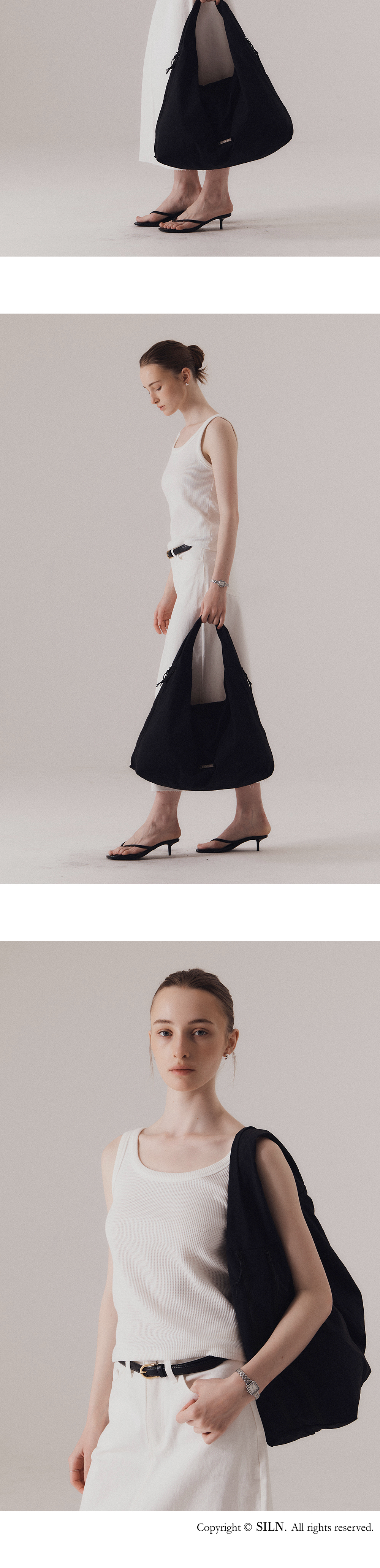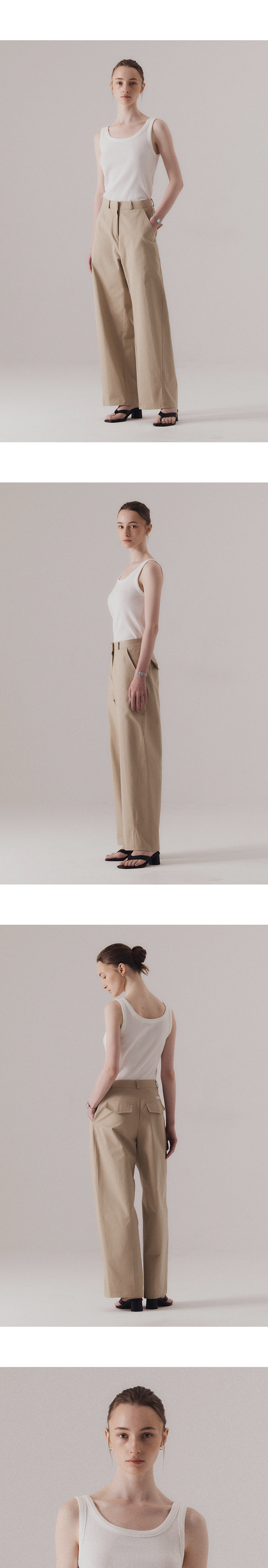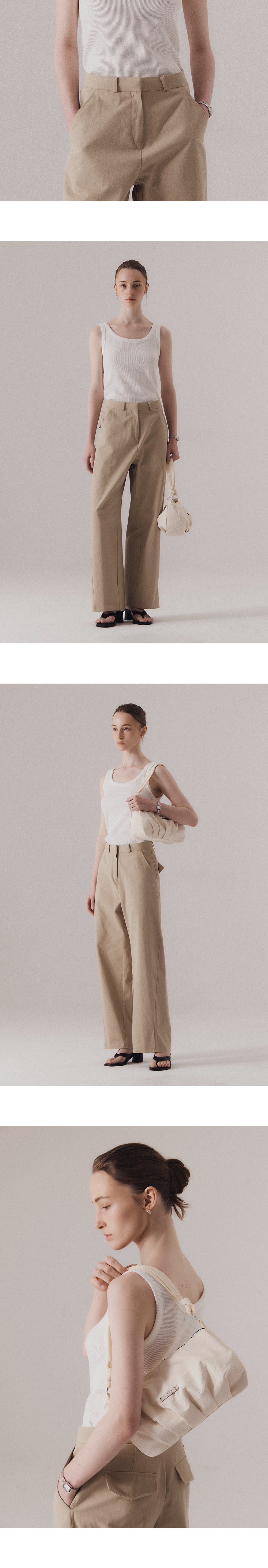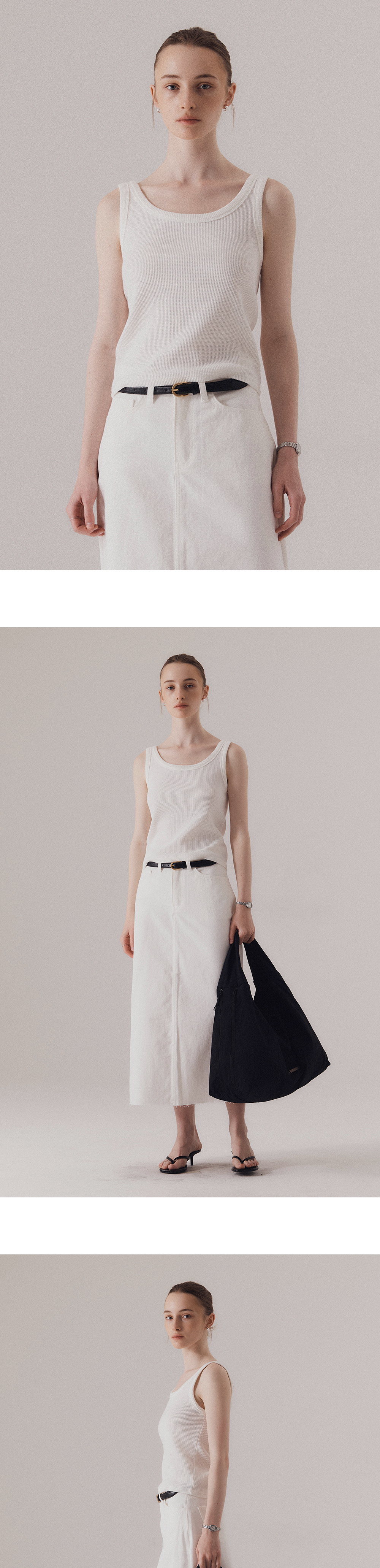 부드러운 곡선의 스쿱넥 라인이 돋보이는 클래식 니트 슬리브리스입니다. 넥 라인은 깊이감 있으면서도 과하지 않게 파여, 쇄골 라인을 은은하게 드러내며 단정한 실루엣을 선사합니다. 밀도 높은 텍스처를 사용하여, 입었을 때 흐트러짐 없이 깔끔한 핏을 선사합니다. 계절에 구애받지 않고 다양한 연출이 가능합니다. 하의 Frayed hem cotton skirt (WHITE), Structure cotton chino pants (BEIGE)를 착용하였습니다.